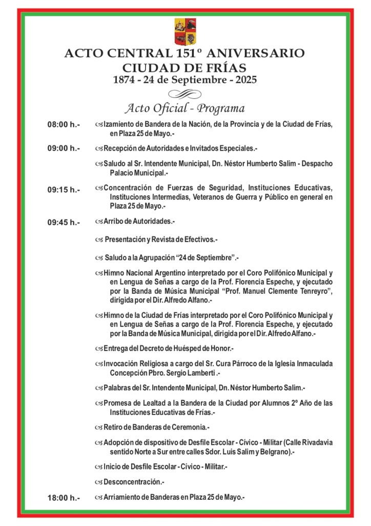 La Municipalidad de FrΓas invita a participar del Acto Oficial y Eventos Conmemorativos por los 151ΒΊ Aniversario Fundacional de la Ciudad, actividades que se desarrollaran de acuerdo al programa oficial.