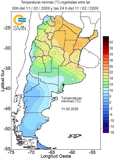 11 FEB | 📉 Esta mañana, ciudades de Patagonia registraron las temp más bajas del país, con valores inferiores a 10 °C.