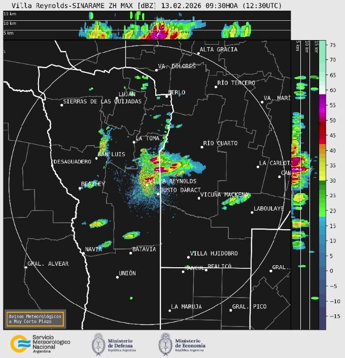 13 FEB | 11:10h ⛈️ Se desarrollan tormentas en sectores de San Luis y Córdoba