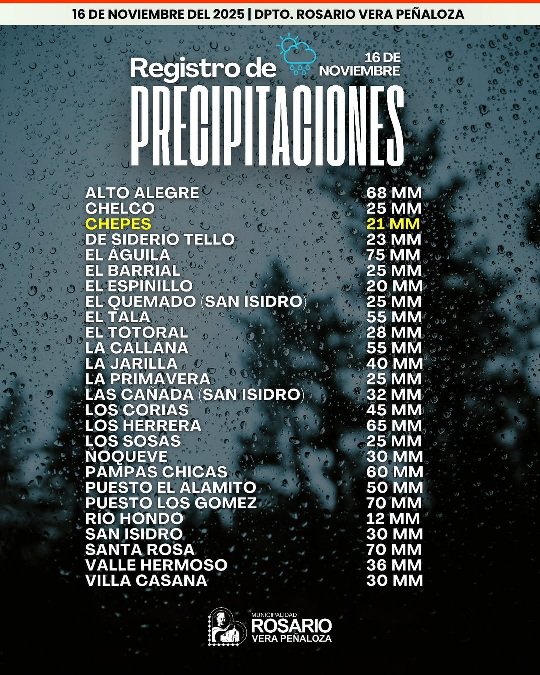 16 DE NOVIEMBRE | REGISTRO DE LLUVIAS EN EL DEPARTAMENTO ROSARIO VERA PEÑALOZA 🌧️