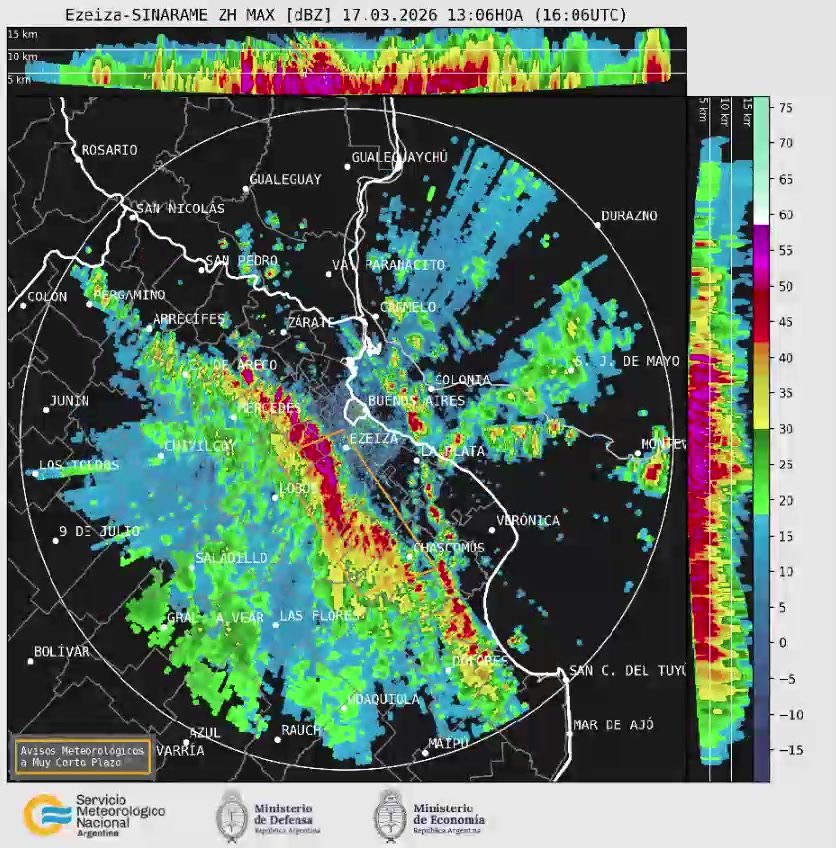 17 MAR | 13:25h ⛈️ Avanzan tormentas de variada intensidad hacia el AMBA. Se prevén lluvias fuertes y ráfagas, con probabilidad de granizo chico.
