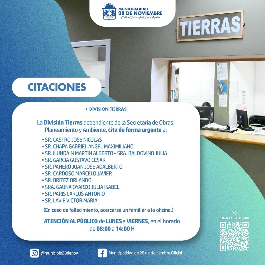 La División Tierras dependiente de la Secretaría de Obras, Planeamiento y Ambiente, cita de forma urgente a:…