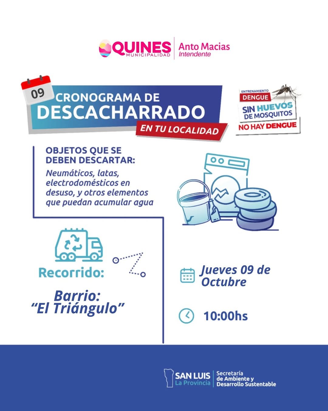 En un trabajo conjunto entre la Municipalidad de Quines y la Planta Recicladora “La Jarilla”, comenzamos con el “DESCACHARRADO” en nuestra ciudad. 🛞🪴🥫🪣 🚛 La batea estará mañana jueves 9 de octubre a las 10:00 horas en la intersección de Valverde del Fresno y Av. Córdoba, para desde allí recorrer el Barrio El Triángulo y … Leer más