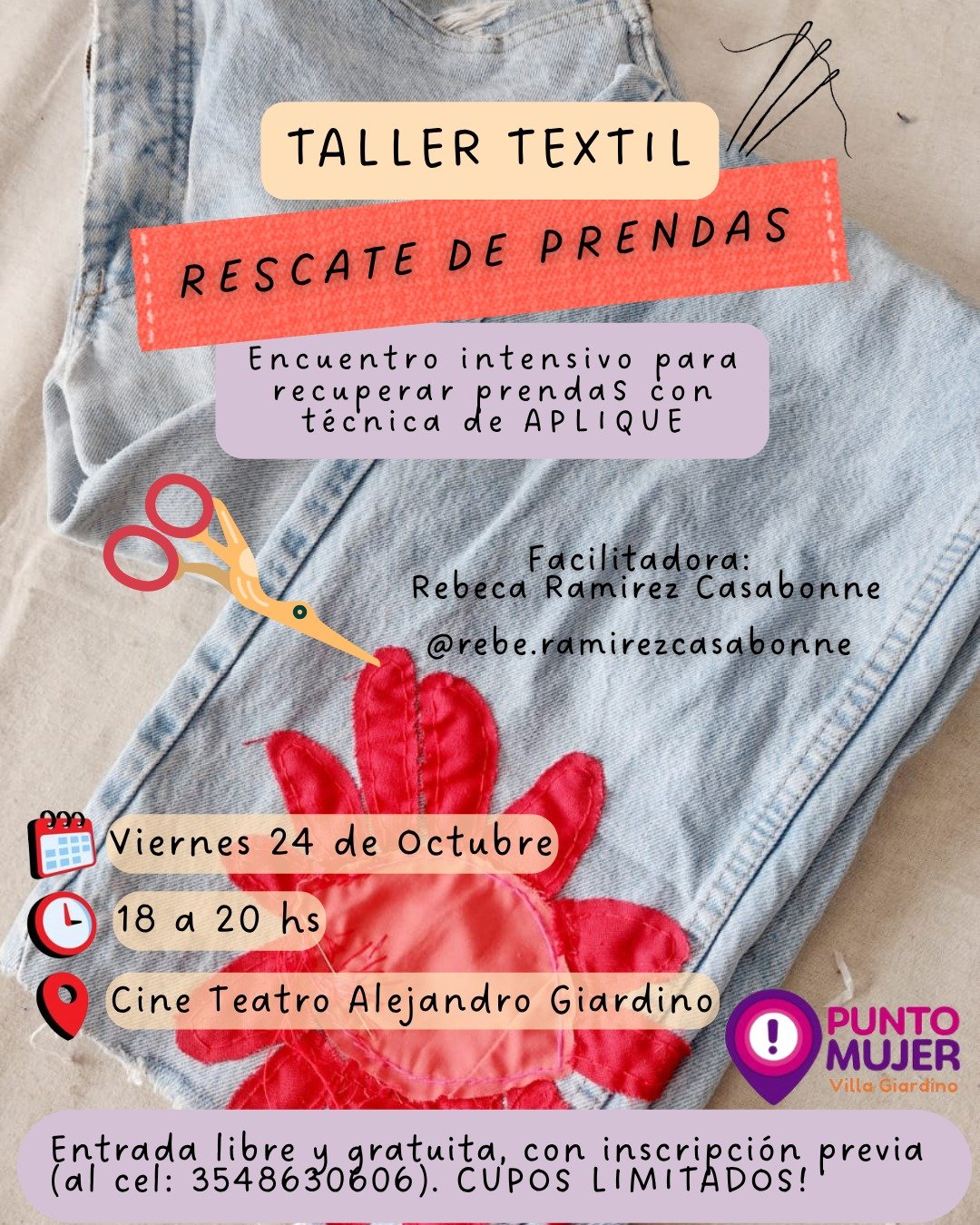 🧵👚 TALLER TEXTIL: RESCATE DE PRENDAS. 🫶🏽💜 Encuentro intensivo para recuperar prendas con técnica de APLIQUE. 📅 Viernes, 24 de octubre 📍Cine Teatro Alejandro Giardino, Villa Giardino 📝Agendalo e inscribite! ✨ Será una experiencia mágica de conexión con tus prendas, creatividad y rescate textil. ☝🏽Dale una nueva oportunidad a ESA prenda. 🤗 👌🏽No es necesario … Leer más