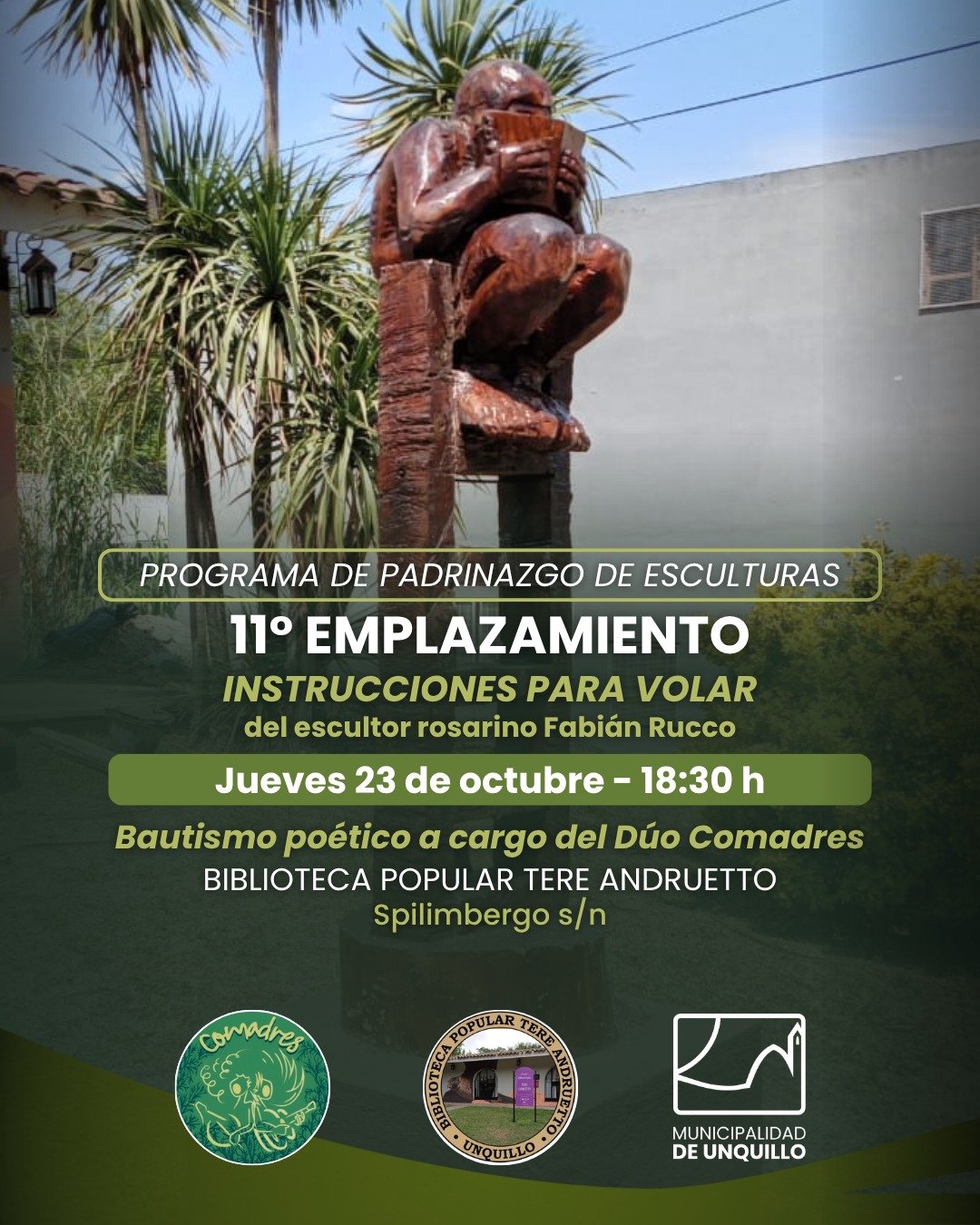✨ CONTINÚAN LOS EMPLAZAMIENTOS DE ESCULTURAS ✨ La Municipalidad de Unquillo continúa desarrollando el Programa de Padrinazgo de Esculturas, poniendo en valor y distribuyendo el patrimonio escultórico por todo el territorio de la ciudad. 🌳 🗿 11º emplazamiento – jueves 23 de octubre 🕡 18:30 h | Biblioteca Popular Tere Andruetto 📖 Bautismo musical a … Leer más