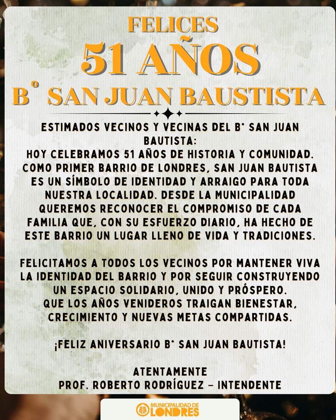 🎉 ¡Felices 51 años, B° San Juan Bautista! 🎉 Celebramos un nuevo año de historia, identidad y comunidad. Nuestro reconocimiento a cada vecino y vecina que hace de este barrio un lugar que crece y se fortalece día a día. ✨ ¡Feliz aniversario, B° San Juan Bautista! ———————————————– Todos los días InfoMunicipios publica en su … Leer más