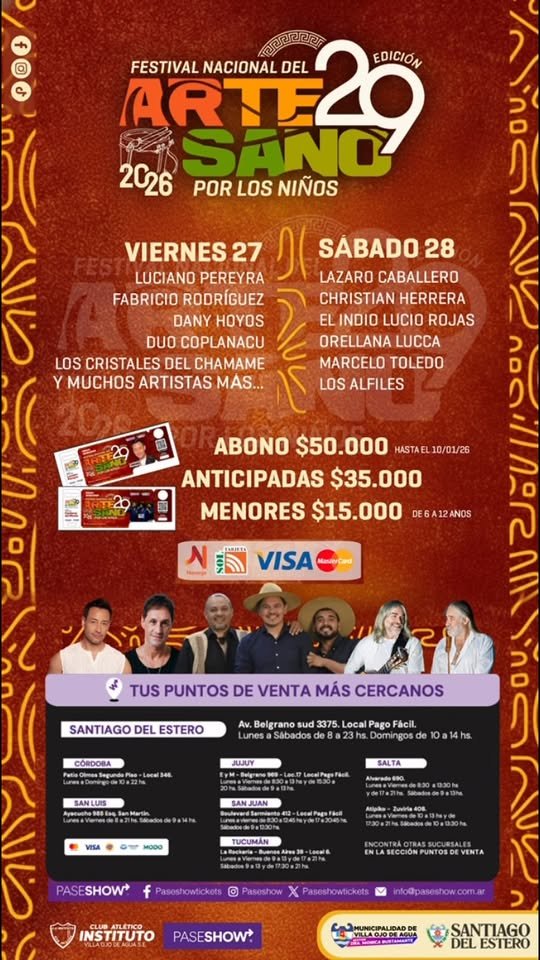 29° FESTIVAL NACIONAL DEL ARTESANO 🎶🎉 🤩 El momento que todos esperaban llegó: nos complace anunciar a los artistas principales del 29° Festival Nacional del Artesano “Por los Niños”: 🎤 Viernes 27 de Febrero: • Luciano Pereyra • Fabricio Rodríguez • Dany Hoyos • Dúo Coplanacu • Los Cristales del Chamamé 🎤 Sábado 28 de … Leer más