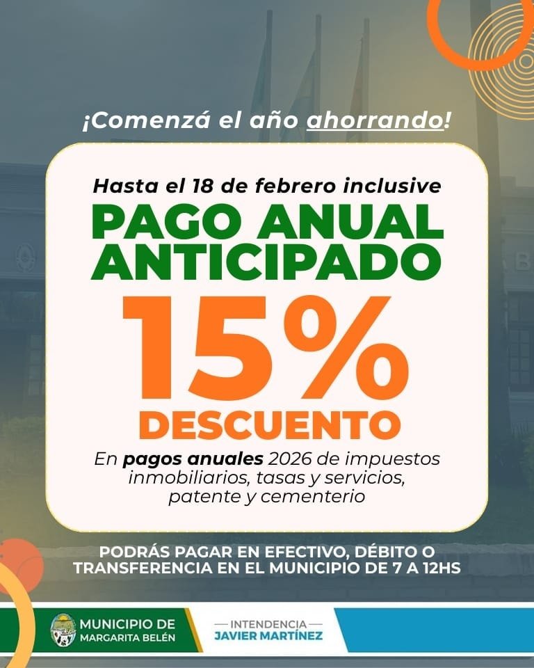 💰 ¡COMENZÁ EL AÑO AHORRANDO! Aprovechá el 15% de descuento con el Pago Anual Anticipado 2026. ✅️Vigente hasta el 18 de febrero inclusive. #MunicipioPresente #PagoAnualAnticipado #GestiónJavierMartínez ———————————————– Todos los días InfoMunicipios publica en su portal las noticias más importantes de 2900 municipalidades y comunas de toda la nación. Además enviamos a nuestros más de 350.000 … Leer más