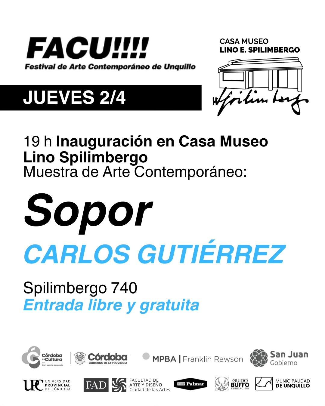 ✨INAUGURACIÓN EN SPILIMBERGO✨ Continúa el FACU!!!! Festival de Arte Contemporáneo de Unquillo 🚪 SOPOR 🚪 de Carlos Gutiérrez 🗓️ Jueves 2 de abril 🕒 19 h | Inauguración de muestra La muestra del artista sanjuanino llega gracias al apoyo del Museo Provincial de Bellas Artes Franklin Rawson y del Gobierno de la Provincia de San … Leer más