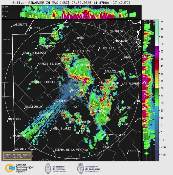 23 FEB | 14:55h ⛈️ Se generan tormentas aisladas, algunas muy intensas, en el centro de Buenos Aires