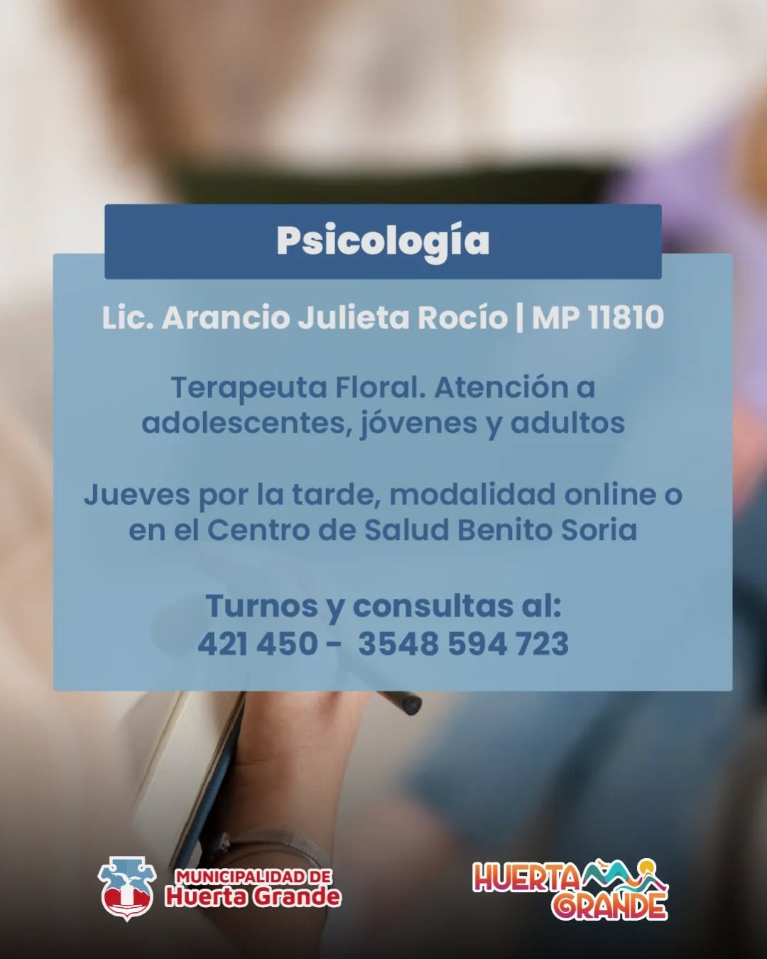 La Lic. Arancio Julieta Rocío brinda atención psicológica y terapia floral para adolescentes, jóvenes y adultos, ofreciendo un espacio de contención y bienestar.