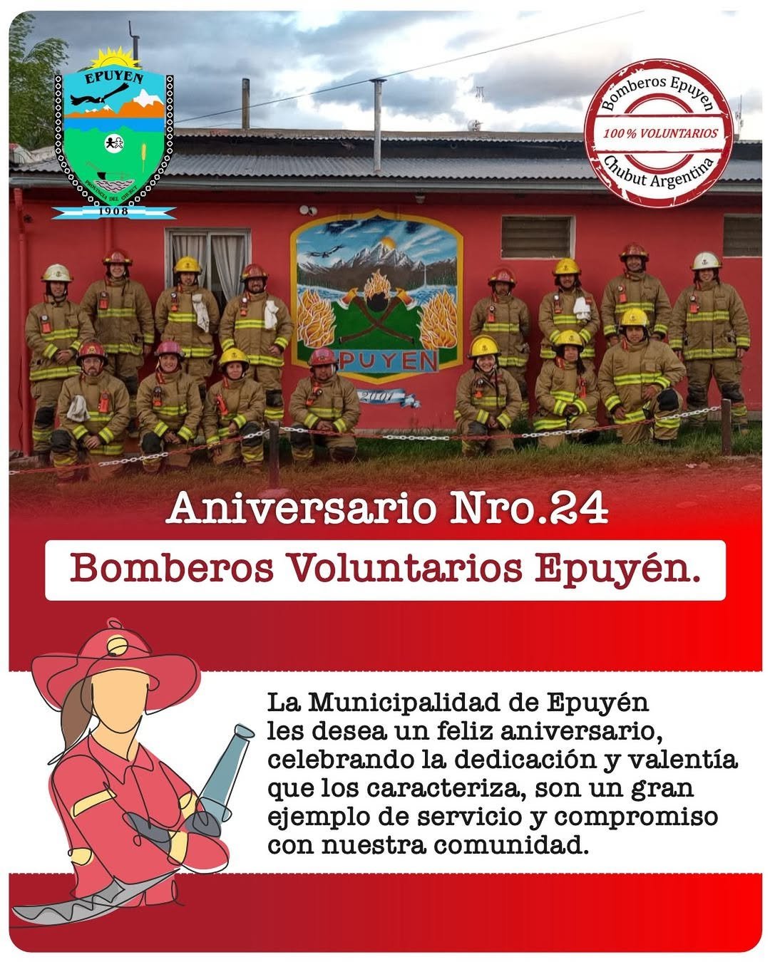 🔸 La Municipalidad de Epuyén saluda a los Bomberos Voluntarios de Epuyén en su aniversario, celebrando 24 años de servicio y compromiso con la comunidad.