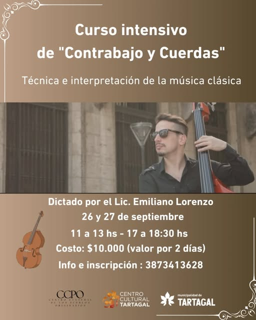 • El Lic. Emiliano Lorenzo llega a Tartagal con un Curso Intensivo de Contrabajo y Cuerdas, sumando también un Taller de Bajo. Una oportunidad única para perfeccionarte en técnica e interpretación.