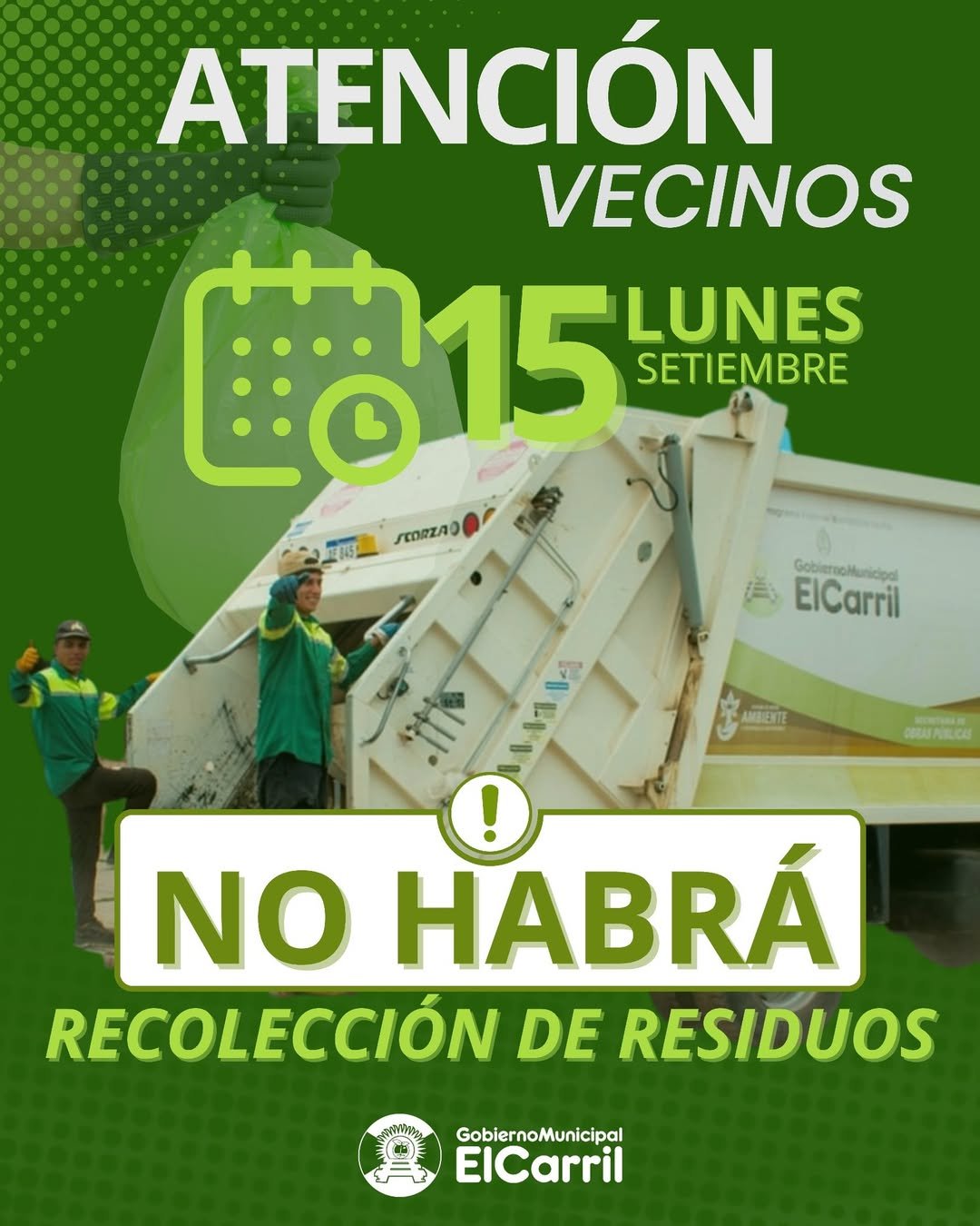 🗓️ Debido al feriado provincial del lunes 15 de septiembre, el servicio de recolección NO se realizará ese día.