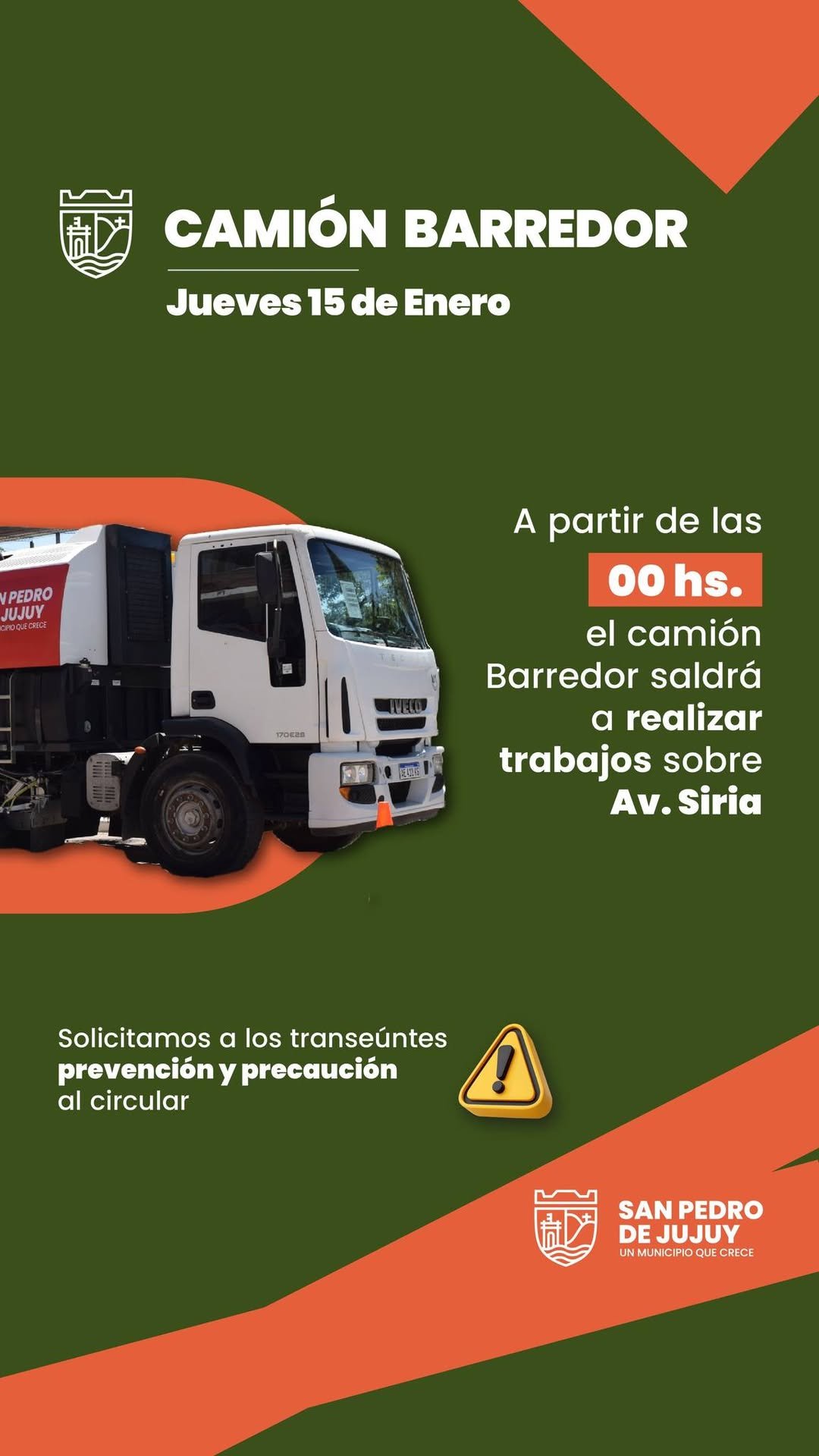 La Municipalidad de San Pedro de Jujuy informa que el camión barredor estará realizando tareas de limpieza sobre Avenida Siria.