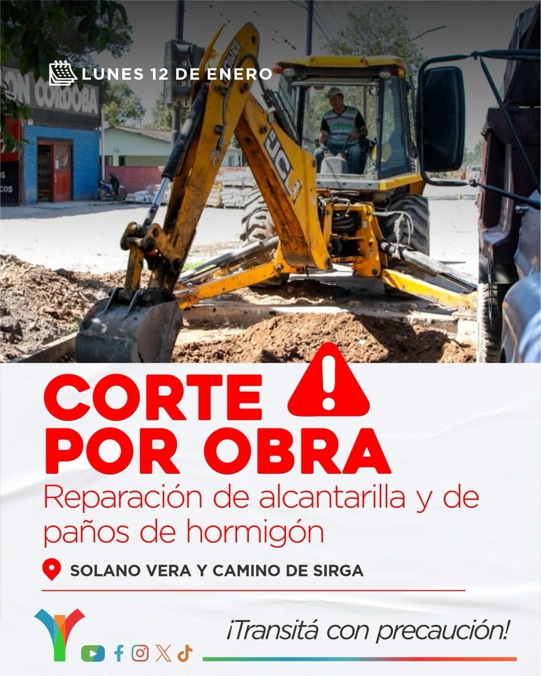 A partir del lunes 12 de enero, se realizará un corte total en Av. Solano Vera y un corte parcial (media calzada) en Camino de Sirga, debido a trabajos de reparación.