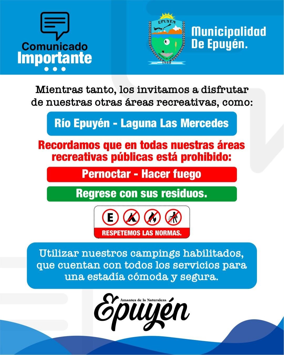 🔸 En el marco de los artefactos encontrados en la orilla del Lago Epuyén, y por tratarse de nuestro atractivo principal, el Parque Municipal Epuyén estará CERRADO hasta nuevo aviso.