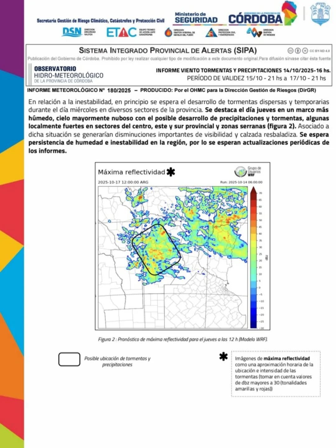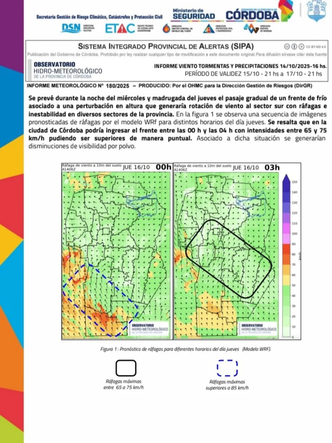 El Servicio Hidrometeorológico de la Provincia de Córdoba emitió un aviso por viento, tormentas y precipitaciones‼️