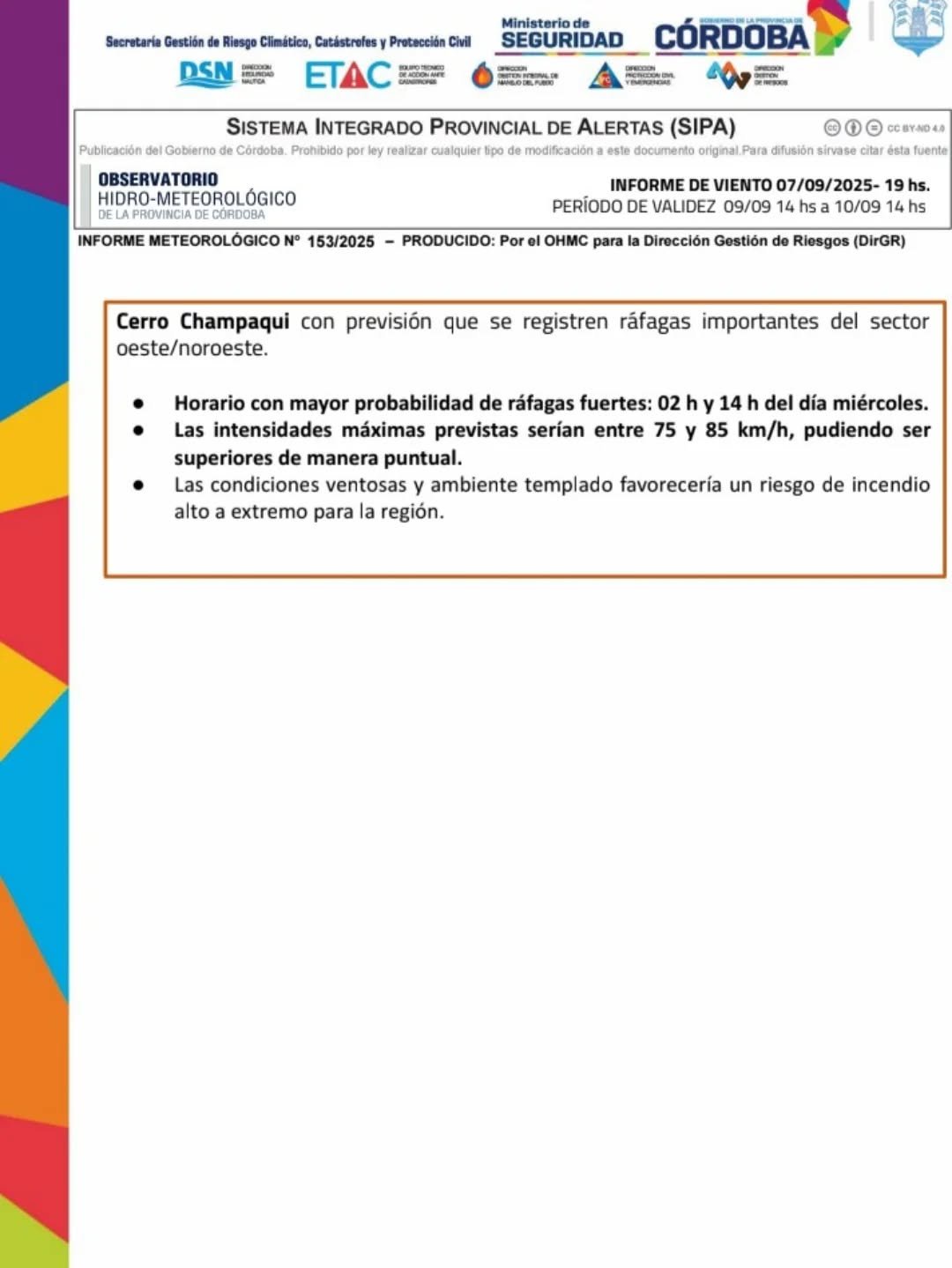 El Servicio Hidrometeorológico de la Provincia de Córdoba emitió un aviso por viento‼️
