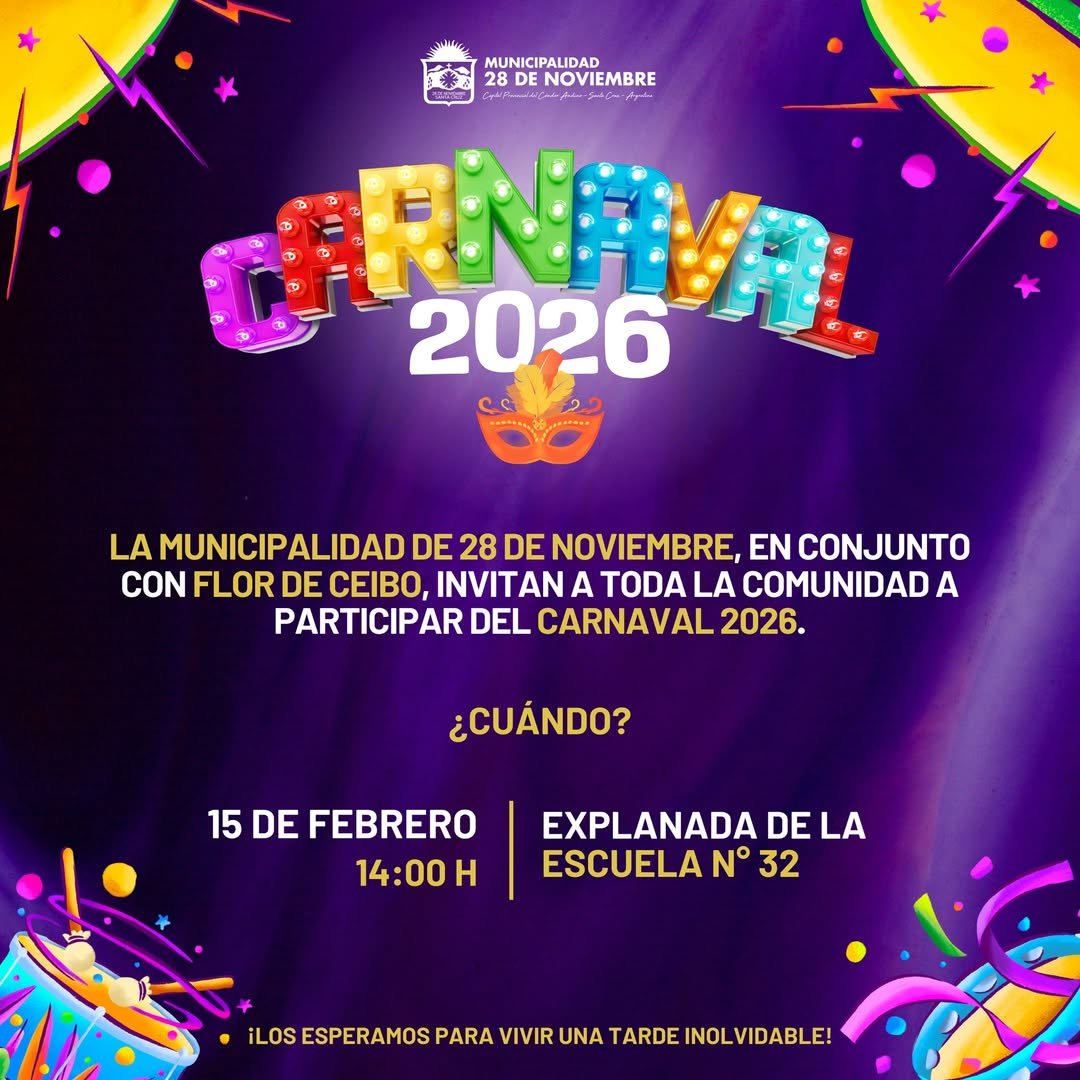La Municipalidad de 28 de Noviembre, en conjunto con Flor de Ceibo, invitan a toda la comunidad a participar del Carnaval 2026.