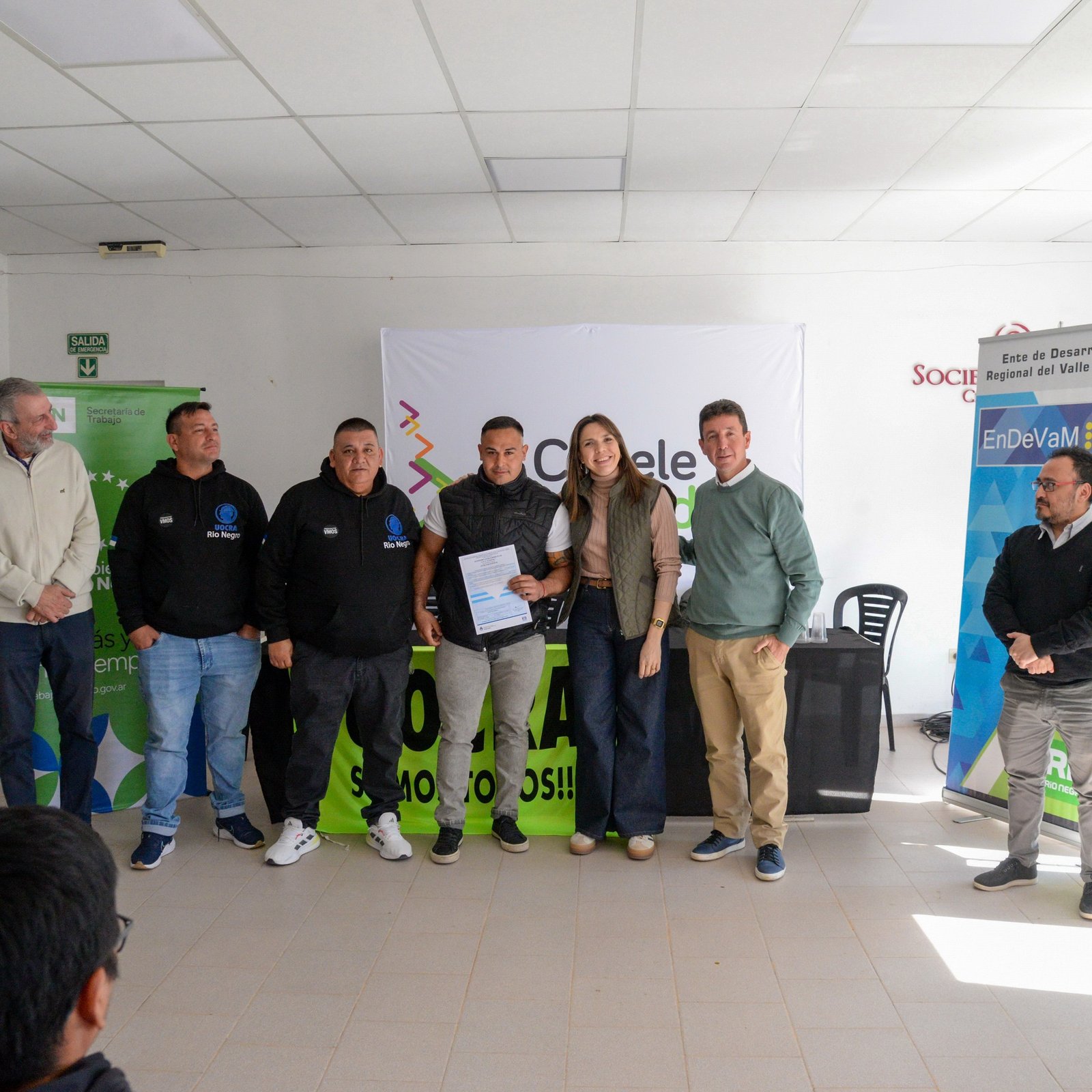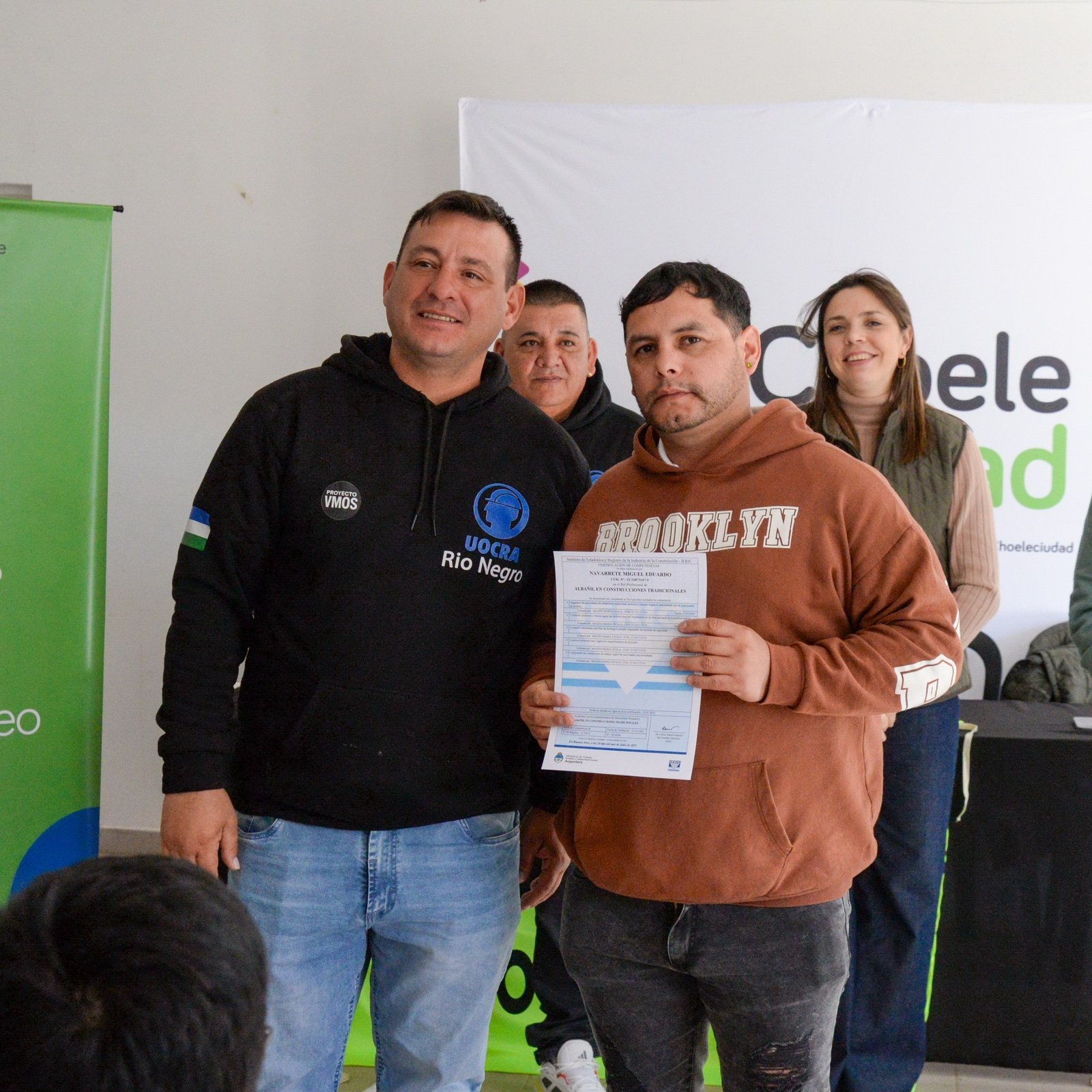 Hoy la Secretaria de Trabajo María Marta Avilez, el Intendente de Chimpay Gustavo Sepulveda y el Intendente Diego Ramello hicieron entrega de los certificados que le permiten a vecinos constructores del Valle Medio avalar sus conocimientos y experiencias en construcción y obras.