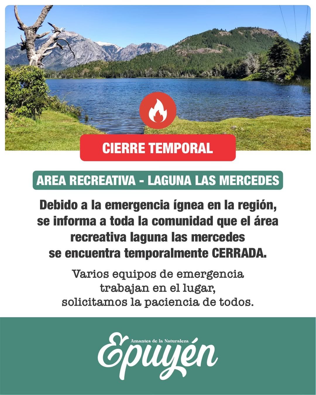 👉🏻 La Dirección de Turismo de la Municipalidad de Epuyén informa que, debido a la emergencia ígnea en la región, el área recreativa Laguna Las Mercedes se encuentra temporalmente CERRADA.