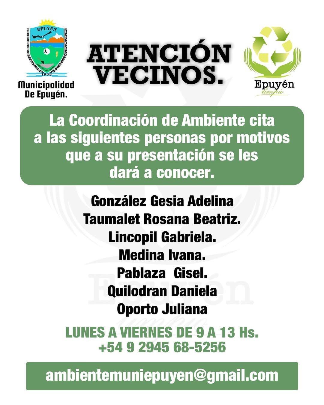 🔸 La Coordinación de Ambiente de la Municipalidad de Epuyén cita a las siguientes personas, por motivos que a su presentación se les dará a conocer.