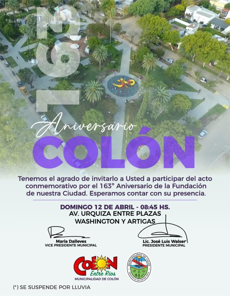 Las actividades comenzarán a las 8:45 con el acto protocolar por el 163° aniversario de la fundación de Colón. La ceremonia se llevará a cabo en avenida Urquiza, entre plazas Washington y Artigas, y contará con la participación de autoridades municipales, instituciones y comunidad en general.