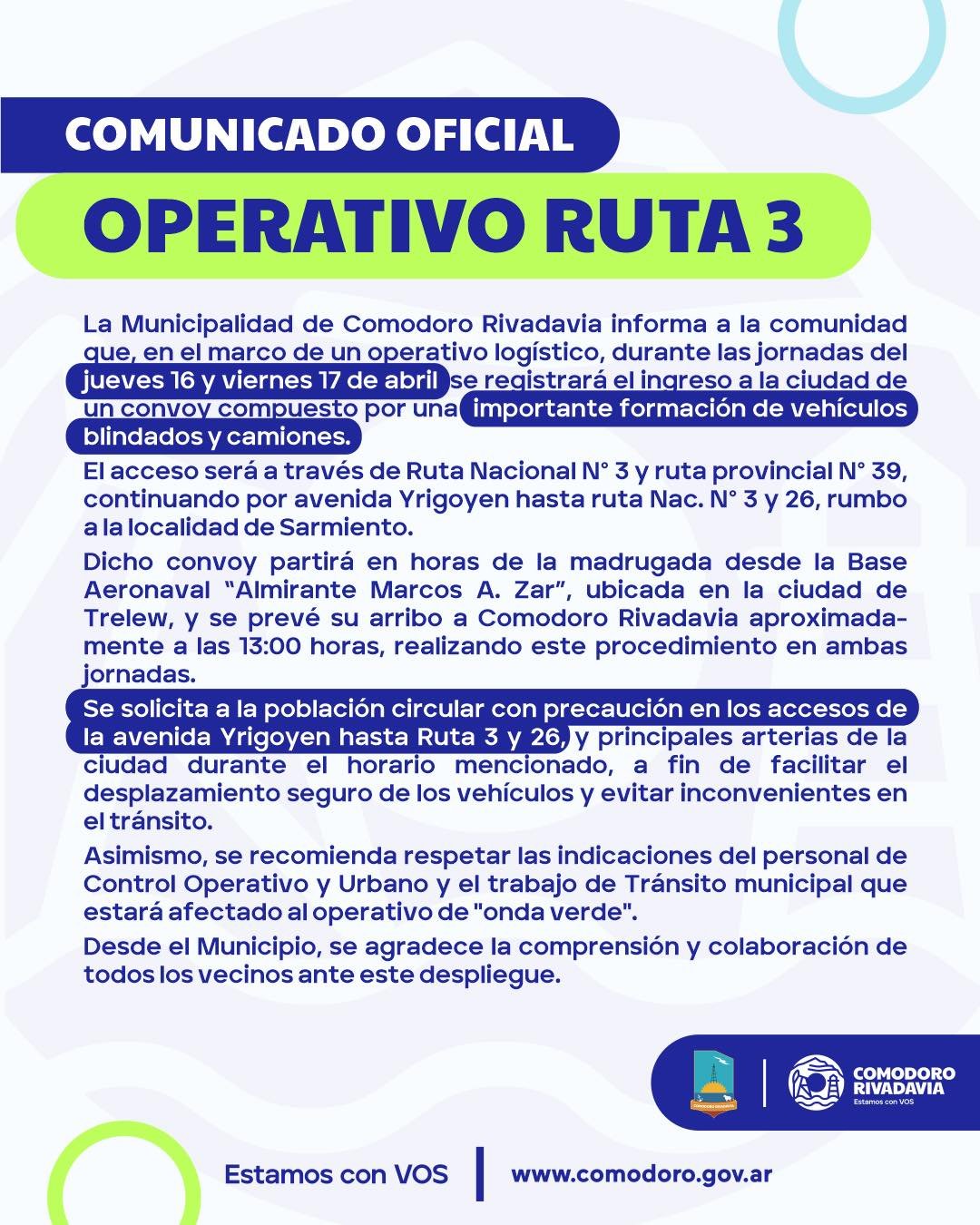 La Municipalidad de Comodoro Rivadavia informa a la comunidad que, en el marco de un operativo logístico, durante las jornadas del jueves 16 y viernes 17 de abril, se registrará el ingreso a la ciudad de un convoy compuesto por una importante formación de vehículos blindados y camiones. El acceso será a través de Ruta Nacional N° 3 y ruta provincial N° 39, continuando por avenida Yrigoyen hasta ruta Nac. N° 3 y 26, rumbo a la localidad de Sarmiento.