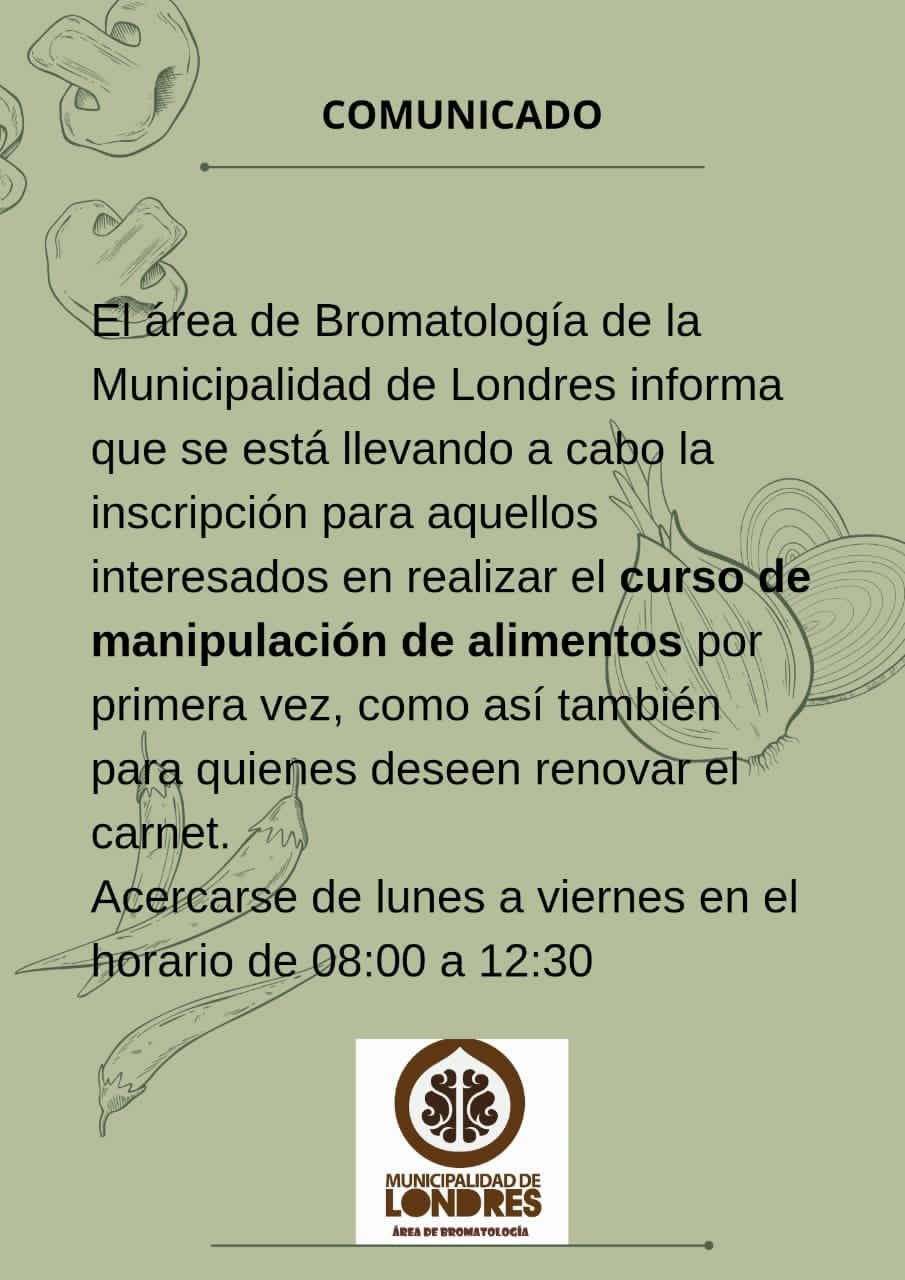 El Área de Bromatología de la Municipalidad de Londres informa que ya se encuentra abierta la inscripción para el Curso de Manipulación de Alimentos 🍽️.