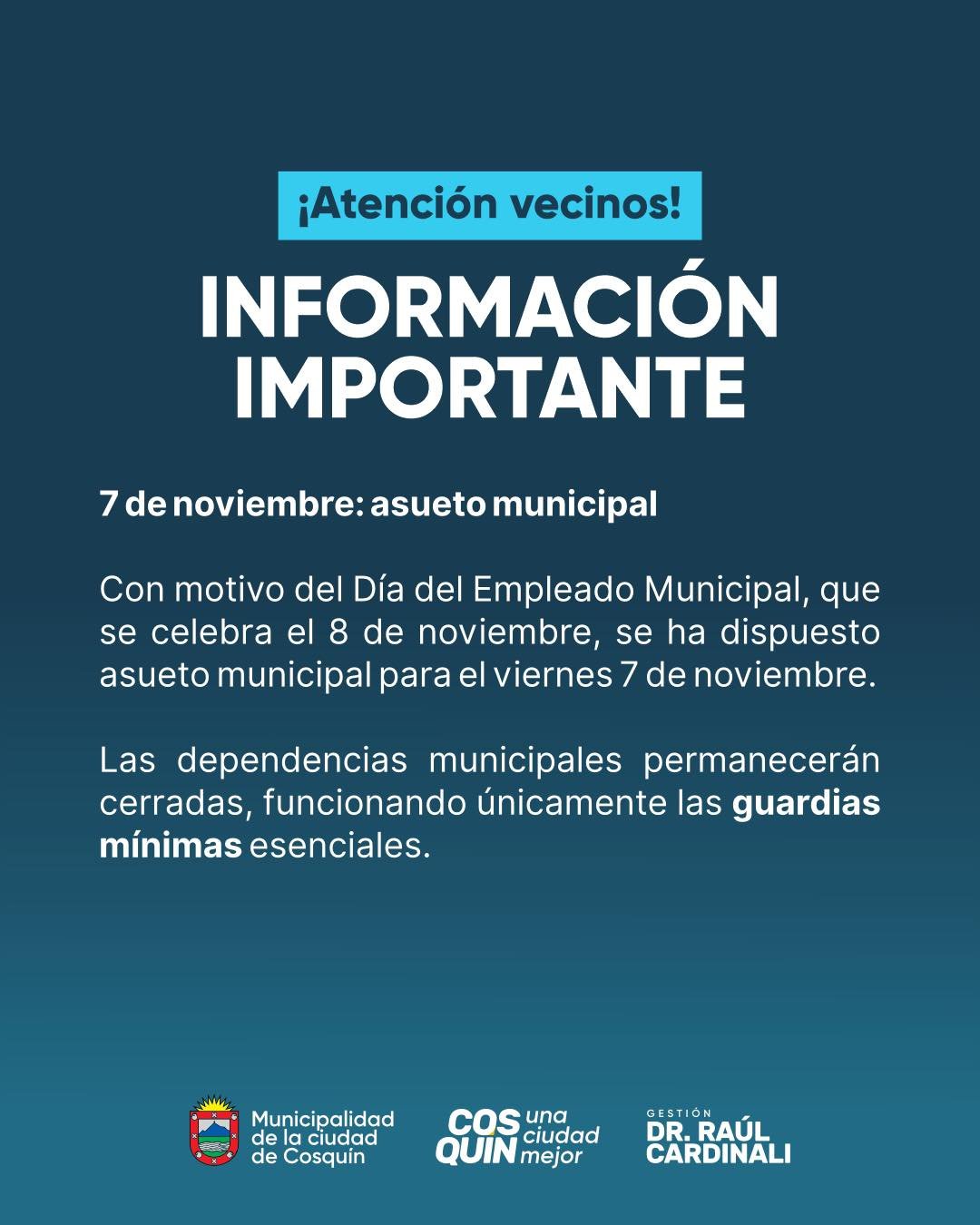 ⚠️ Con motivo del Día del Empleado Municipal, se establece asueto administrativo para el viernes 7 de noviembre, jornada en la que las dependencias municipales permanecerán cerradas. 🙌