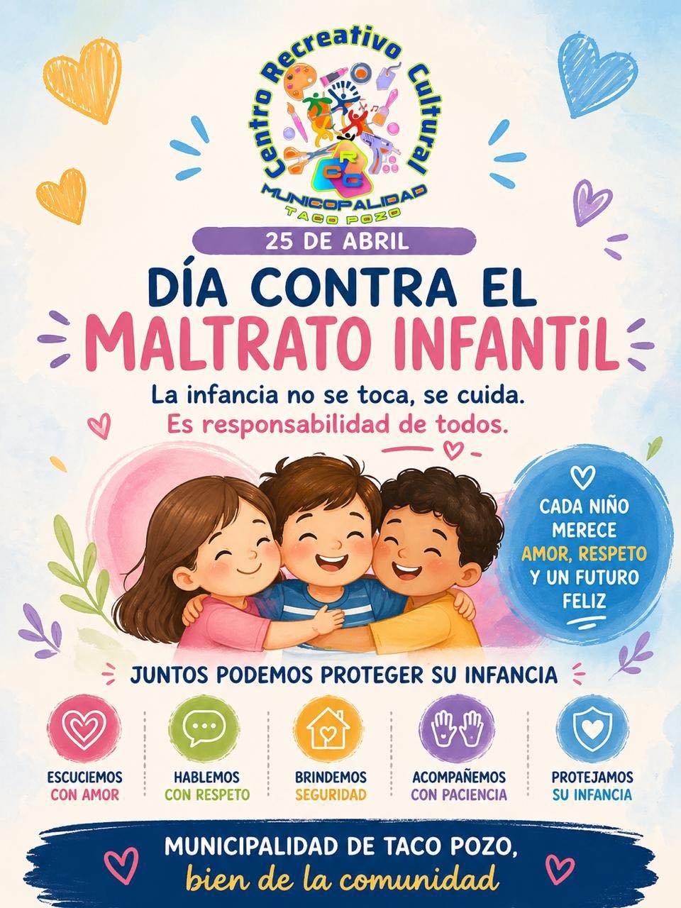 Cuidar la infancia es responsabilidad de todos.En el Día de la Lucha contra el Maltrato Infantil, reafirmamos nuestro compromiso de proteger a quienes más nos necesitan.Estar atentos, escuchar y actuar a tiempo puede marcar la diferencia en la vida de un niño, niña o adolescente.