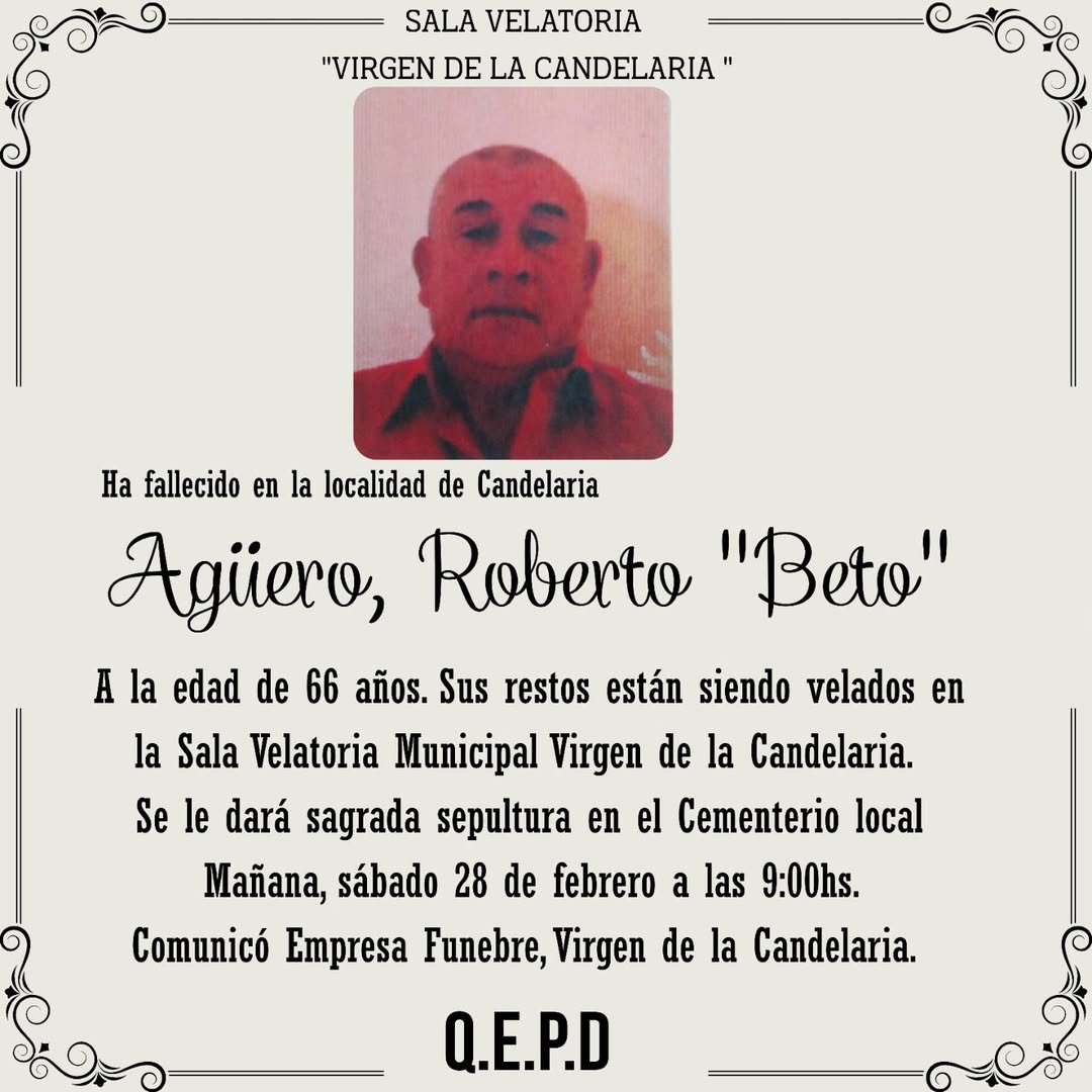 Desde la Municipalidad de Candelaria acompañamos a Familiares y Amigos de Beto Agüero, en este momento de profundo dolor por la irreparable pérdida.