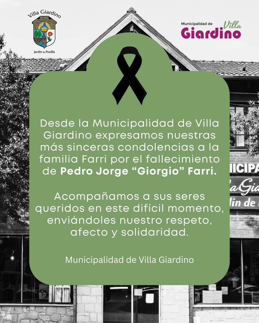 Desde la Municipalidad de Villa Giardino expresamos nuestras más sinceras condolencias a la familia Farri por el fallecimiento de Pedro Jorge “Giorgio” Farri.