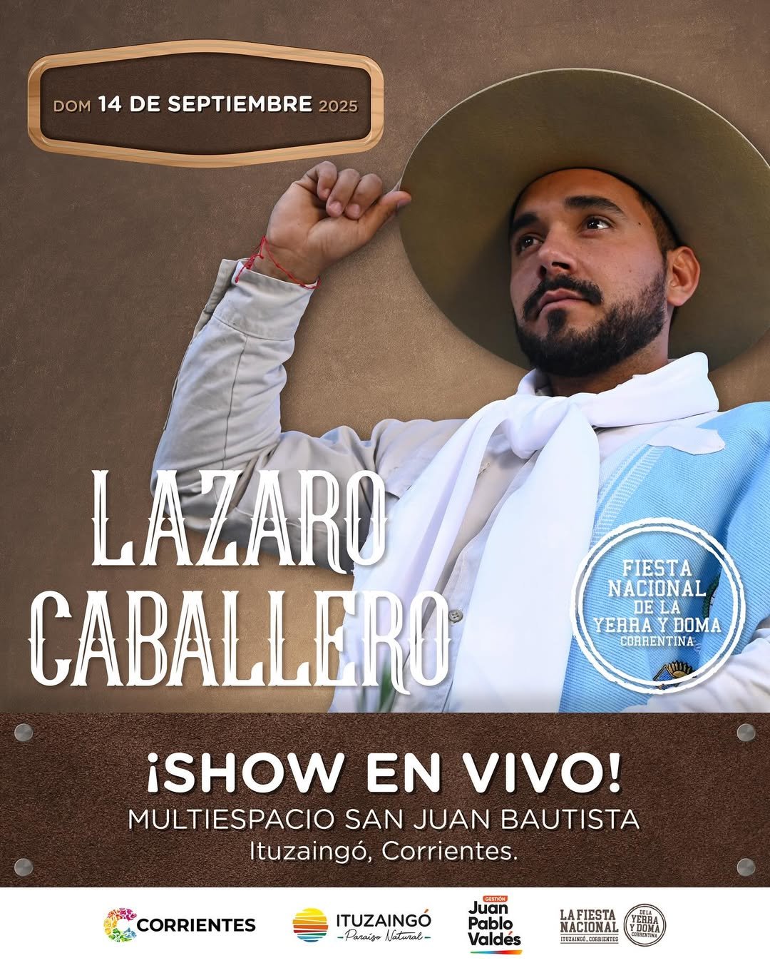 Este domingo 14 de septiembre, en el marco de la Fiesta Nacional de la Yerra y Doma Correntina, disfrutá del show en vivo de Lázaro Caballero en el Multiespacio San Juan Bautista🎵