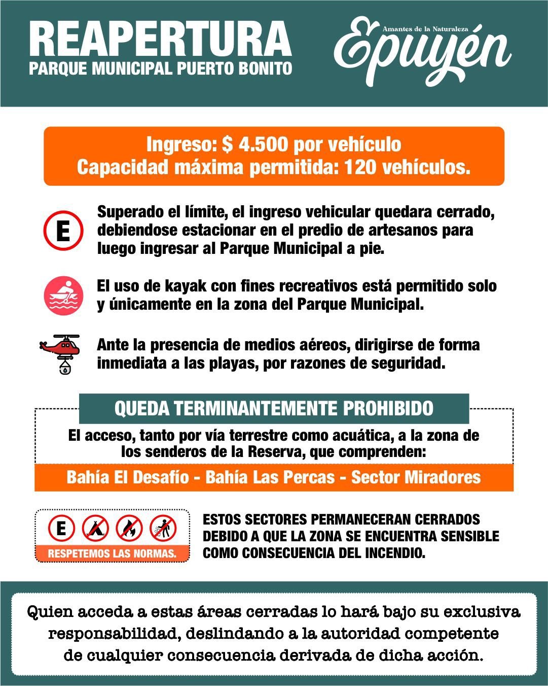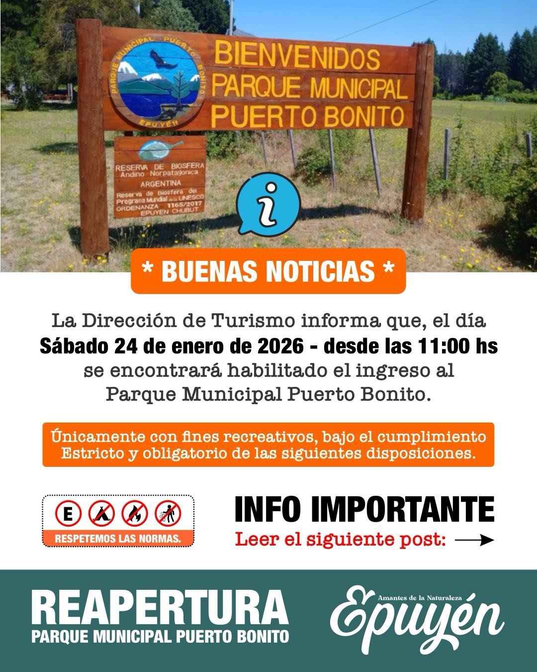 👉🏻 La Dirección de Turismo informa que a partir de hoy, sábado 24 de enero de 2026, desde las 11:00 horas, se encuentran habilitadas las playas del Parque Municipal Puerto Bonito, únicamente con fines recreativos y bajo cumplimiento estricto y obligatorio de las siguientes disposiciones: