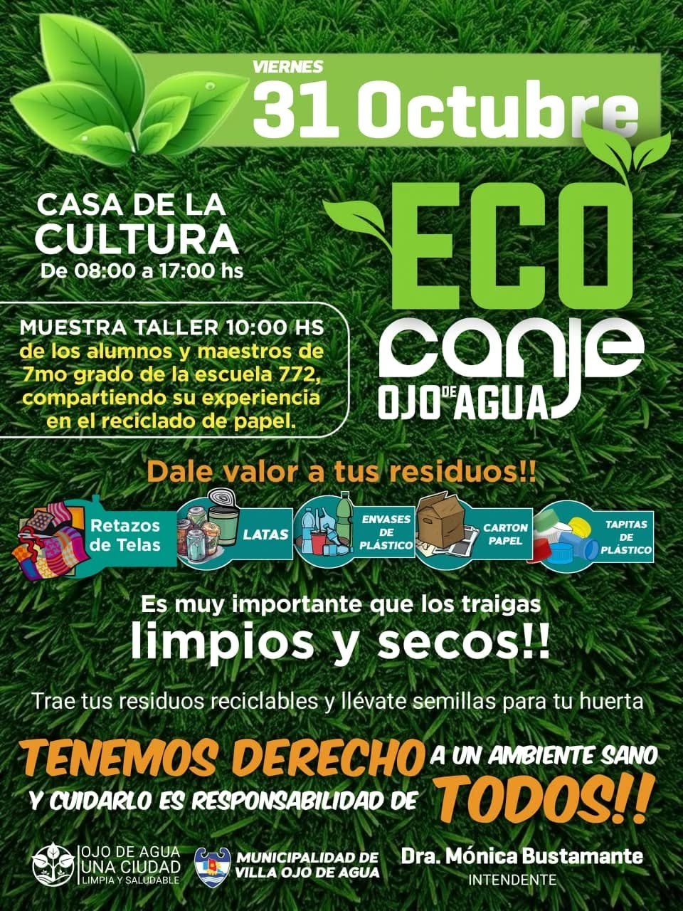 📣La Municipalidad de Villa Ojo de Agua invita a la comunidad a seguir participando de las jornadas de recepción y canje de residuos reciclables.