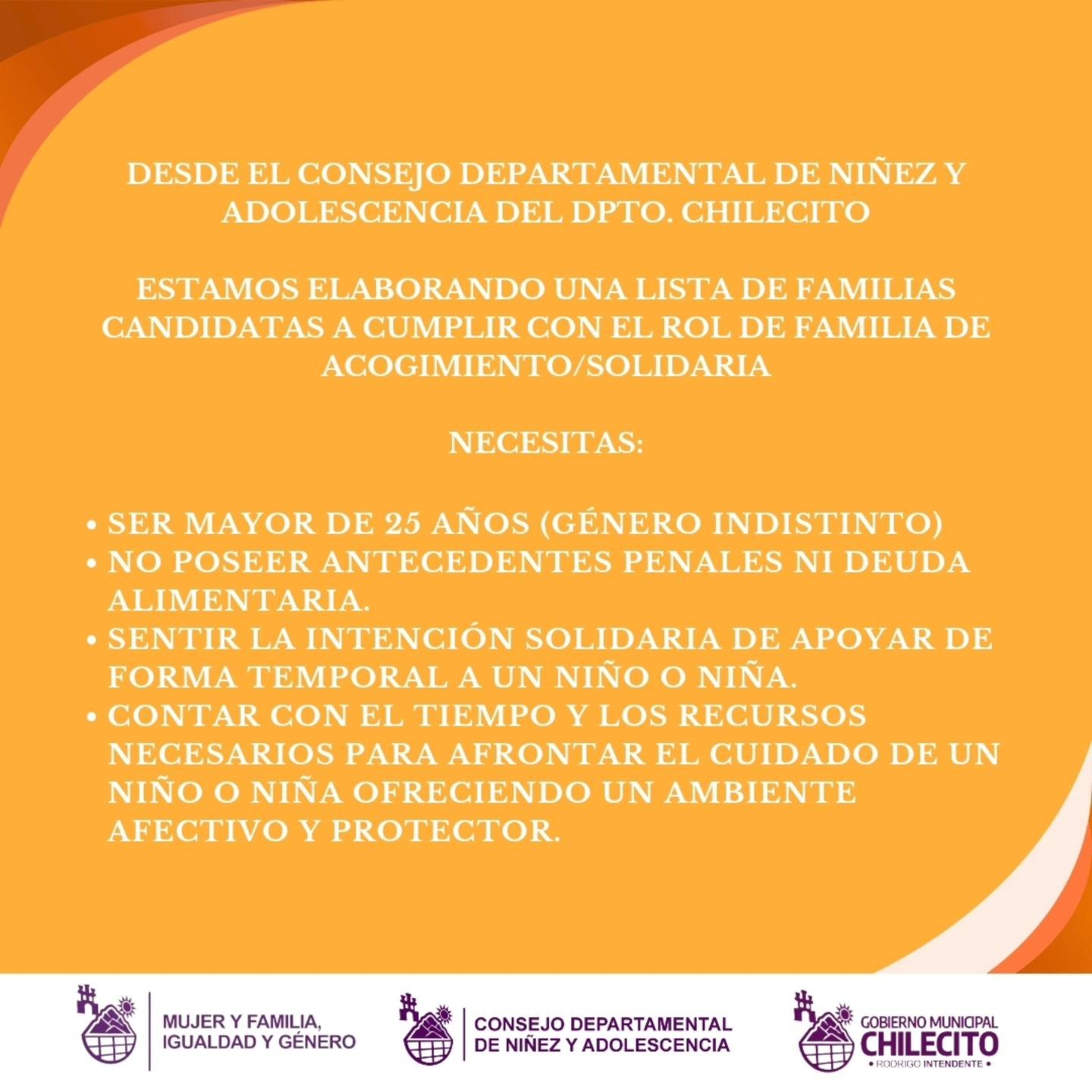🟡 El Consejo Departamental de Niñez y Adolescencia del Departamento Chilecito informa a la comunidad que se encuentra abierta la convocatoria para conformar un registro de familias de acogimiento/solidarias.