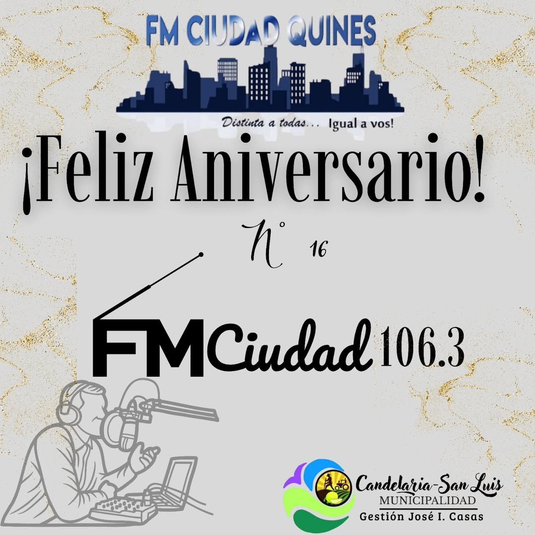 El Intendente Municipal Lic. José Ignacio Casas en representación del pueblo de Candelaria, hace llegar un afectuoso saludo a todo el equipo de FM Ciudad 106.3 – Quines por su aniversario N°16.