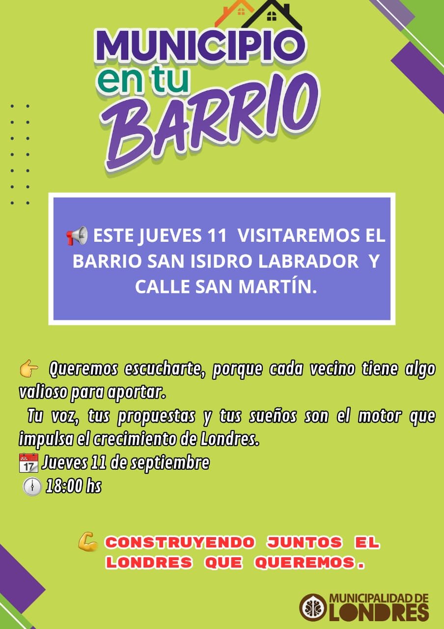 Este jueves 11 de septiembre a las 18:00 hs estaremos visitando el Barrio San Isidro Labrador y la calle San Martín.