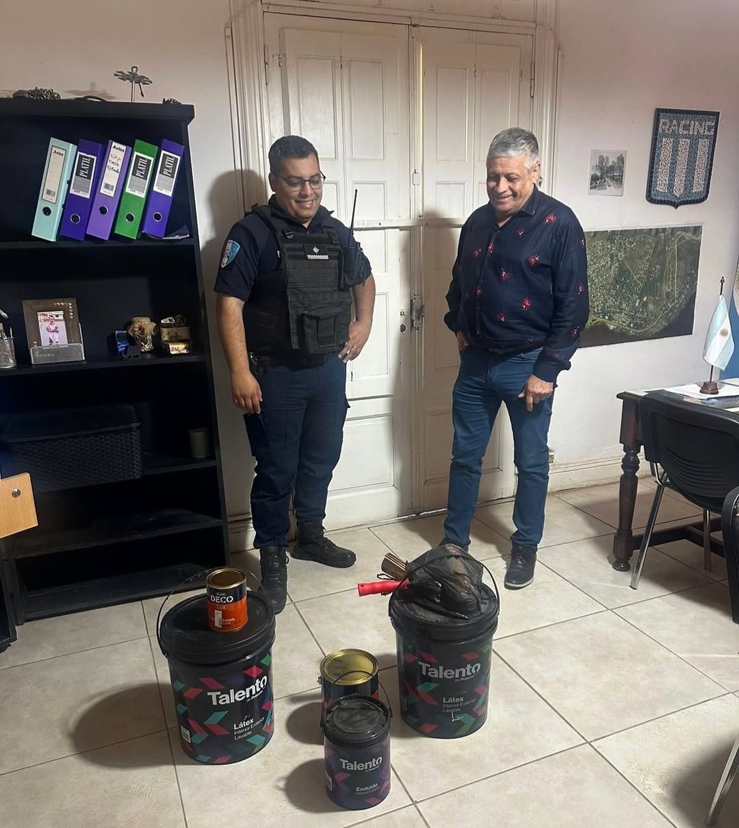 🤝 El Presidente de la Comuna de San Roque entregando pintura para el Edificio Policial, al Crio Jhonatan ALBA, Jefe del CAP.