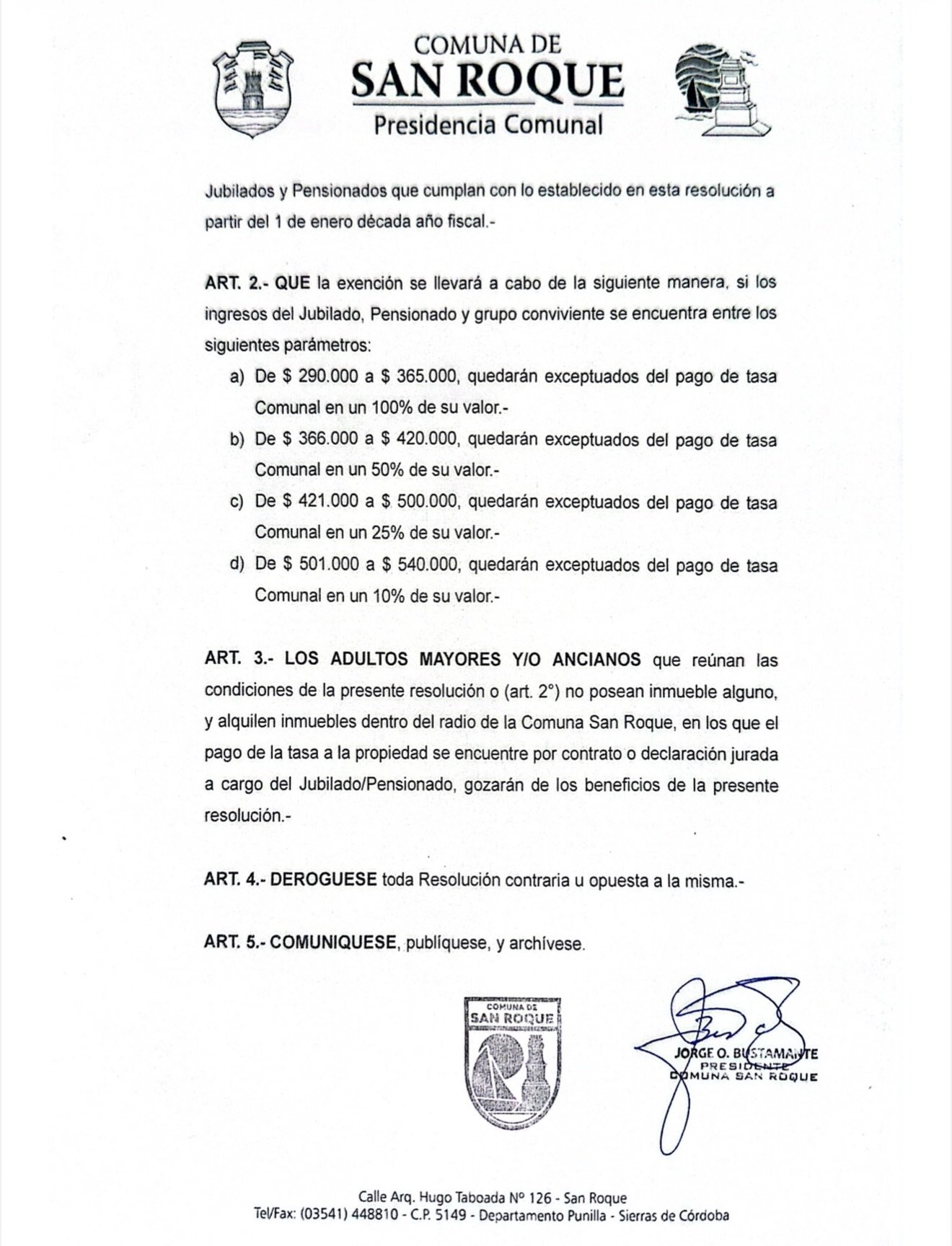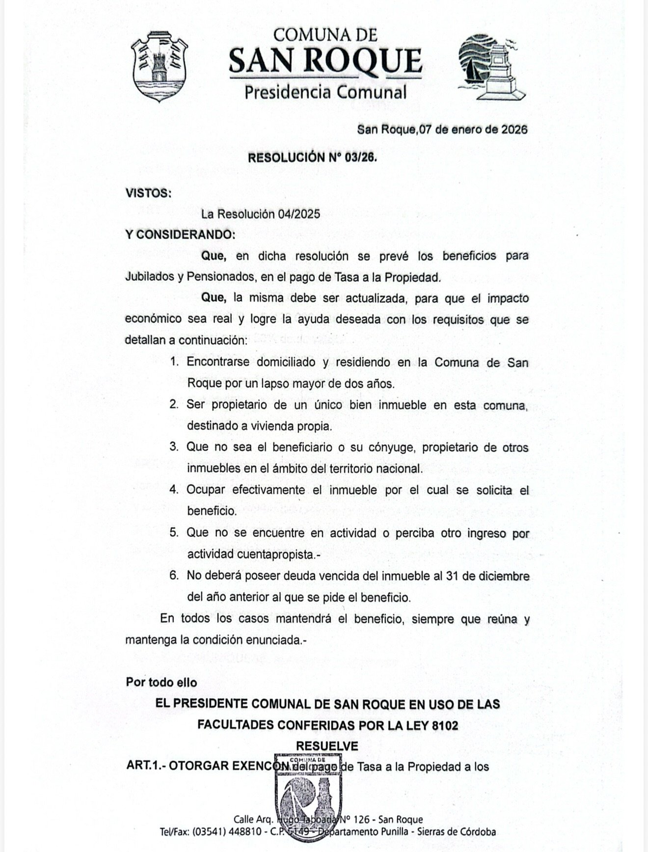 📄 El Presidente de la Comuna informa que, a través de la Resolución N°3/2026, se actualizaron los montos para la eximición del pago de tasa a la propiedad, a jubilados y pensionados.