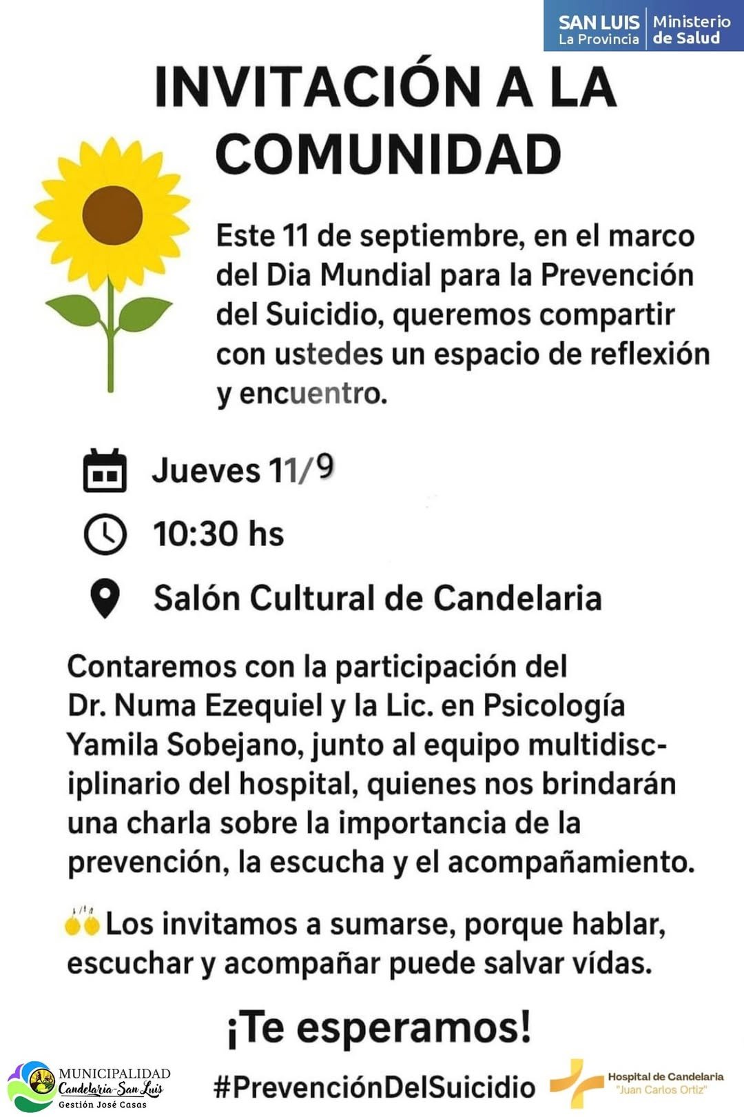 Desde Municipalidad de Candelaria acompañamos esta iniciativa de prevención e invitamos a toda la comunidad a participar de esta actividad, que será un espacio de escucha, diálogo y acompañamiento, organizada por el personal del hospital de nuestra localidad.