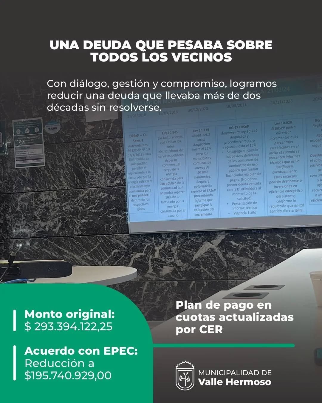 Pero cuando se quiere poner la casa en orden, no hay atajos. Con diálogo, gestión y compromiso, se logró acordar con EPEC una reducción importante de la deuda, que bajó a $195.740.929,00, y además, se estableció un plan de pago en cuotas actualizadas por CER.
