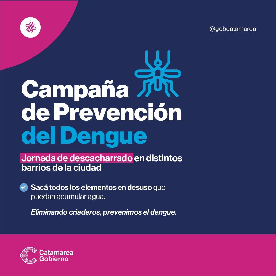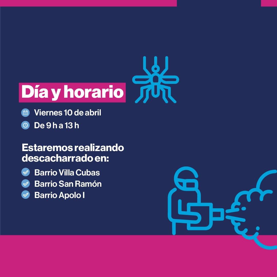 🚮Este viernes se realizará un operativo de descacharrado en barrios. Por eso, te pedimos que saques a la vereda todos los elementos en desuso que puedan acumular agua: latas, botellas, neumáticos y recipientes.