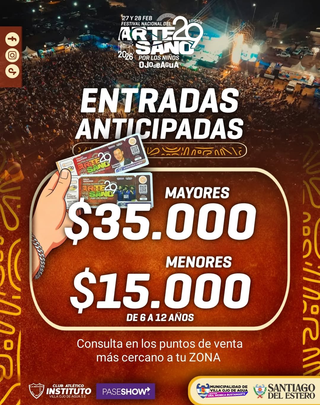 đ« ConseguĂ tus entradas anticipadas para el Festival Nacional del Artesano en la Municipalidad de Villa Ojo de Agua y en los puntos de venta habilitados: