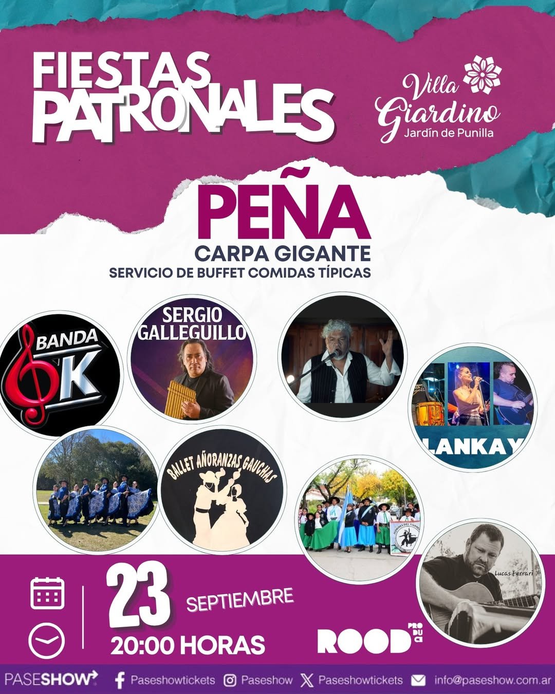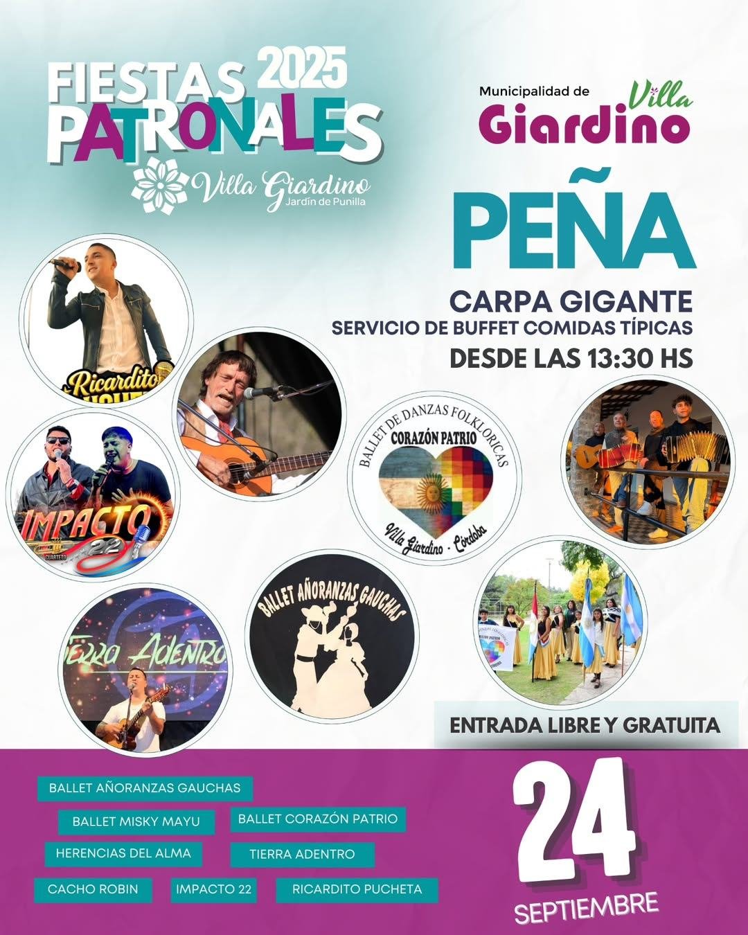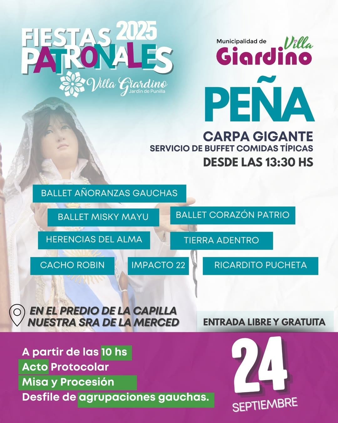 📅 Miércoles 24/09: A partir de las 10:00 hs, se llevará a cabo el acto protocolar, misa, procesión y desfile de agrupaciones gauchas. Desde las 13:30 hs, la Carpa Gigante recibirá nuevamente a vecinos y turistas con servicio de buffet de comidas típicas, y un escenario lleno de música y danzas con la participación de Ballet Añoranzas Gauchas, Ballet Corazón Patrio, Ballet Misky Mayu, Tierra Adentro, Herencias del Alma, Cacho Robin, Impacto 22, Ricardito Pucheta y Llawar Llajta