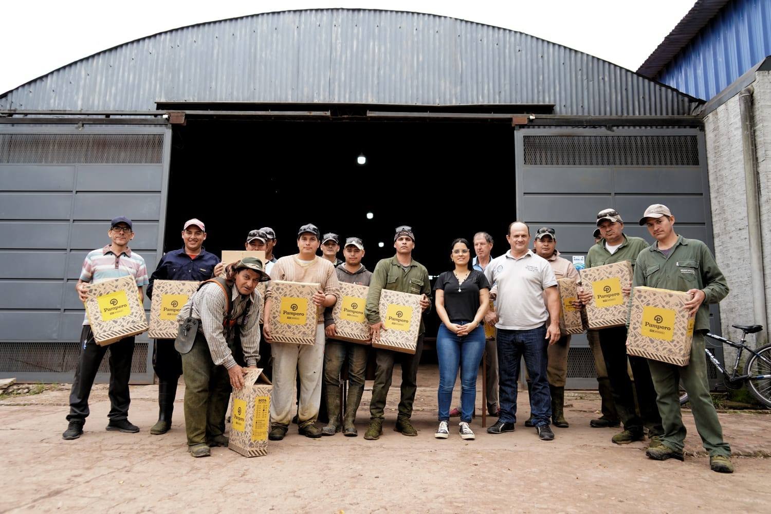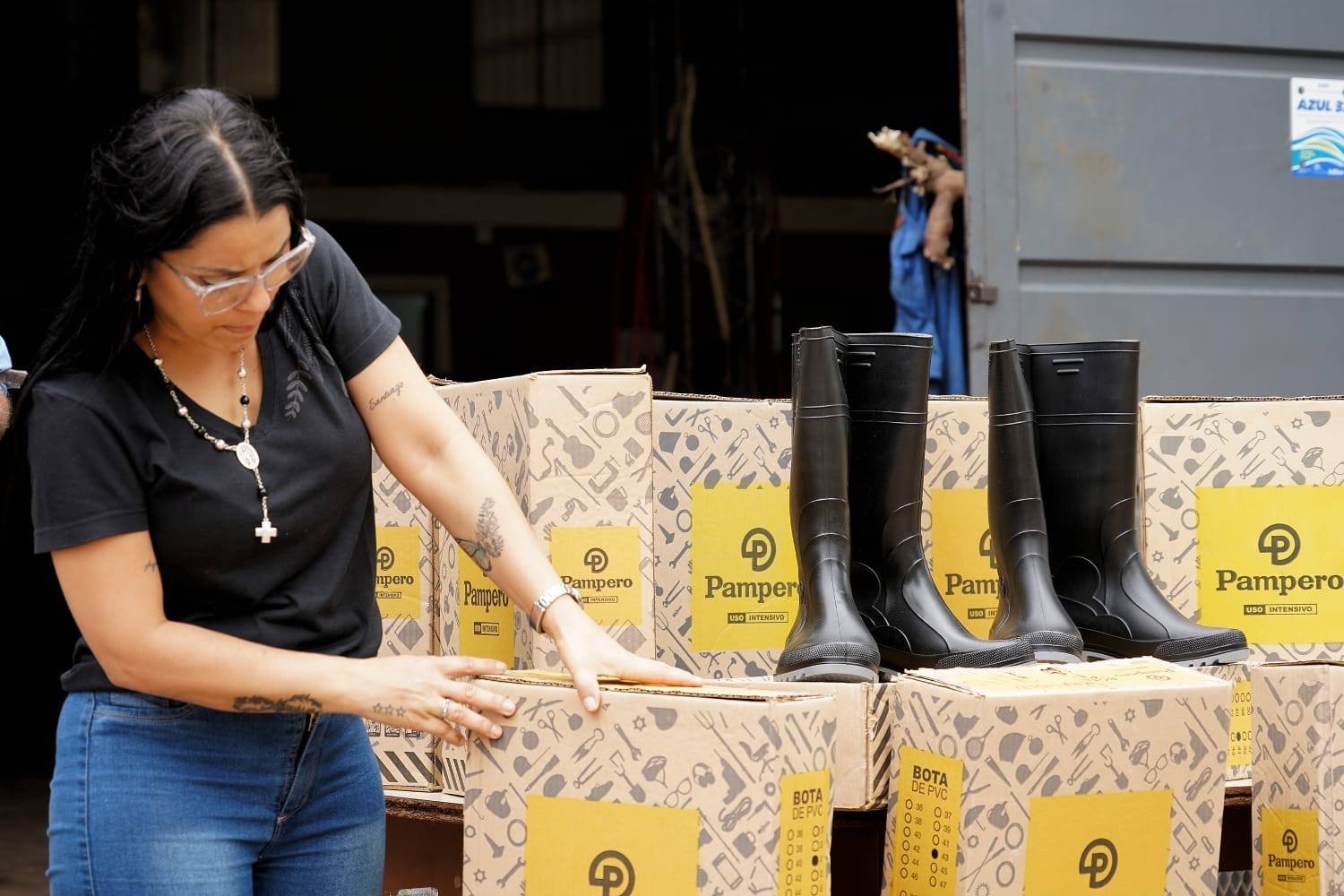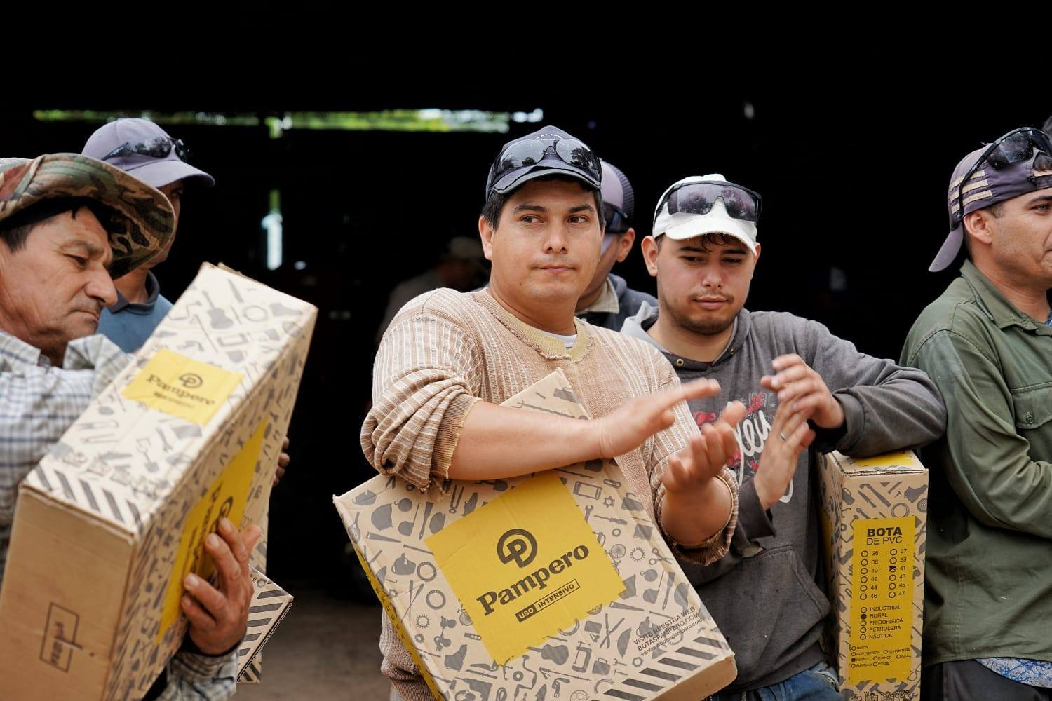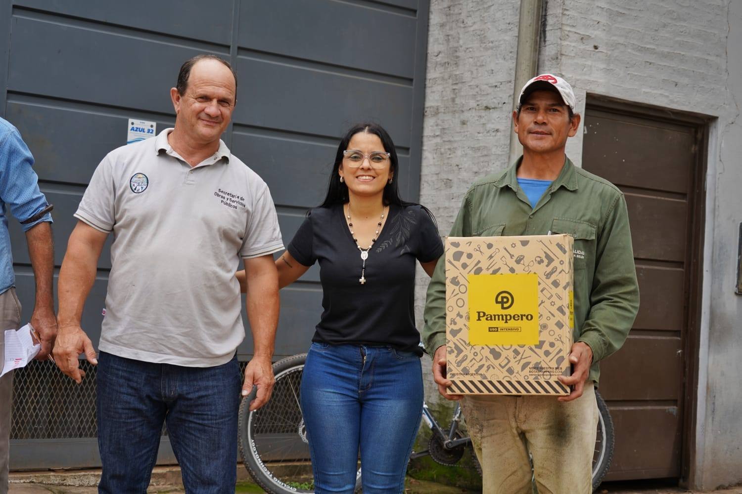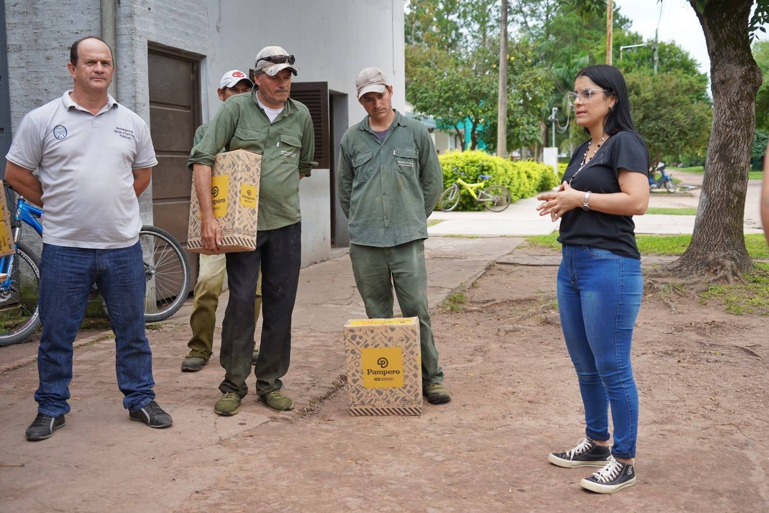 La Presidente del Concejo, María de los Ángeles Fretes, junto al Secretario de Obras Públicas, Gustavo Valussi, realizaron la entrega de botas al personal municipal encargado de las tareas de corte de pasto y limpieza de nuestra localidad.