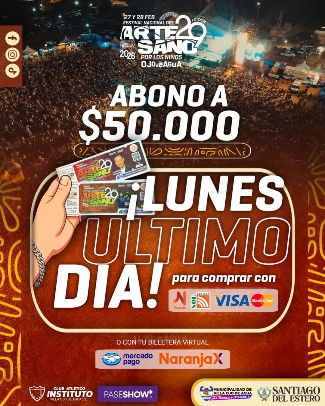 🎫 Hoy lunes último día para adquirir el Abono por las 2 noches a $50.000. Conseguilo en la Municipalidad y en los puntos de venta habilitados en Ojo de Agua, Sol de Julio, Sumampa y Río Seco 📍