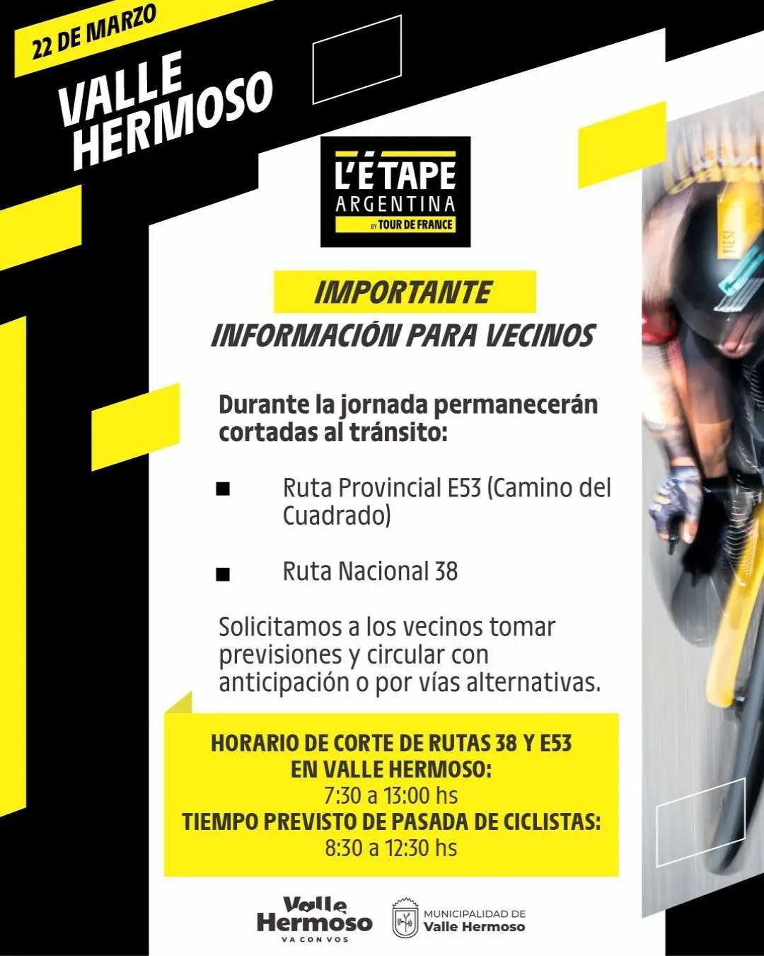 🚴‍♂️ Tiempo previsto de pasada de ciclistas por Valle Hermoso: 8:30 a 12:30 hs